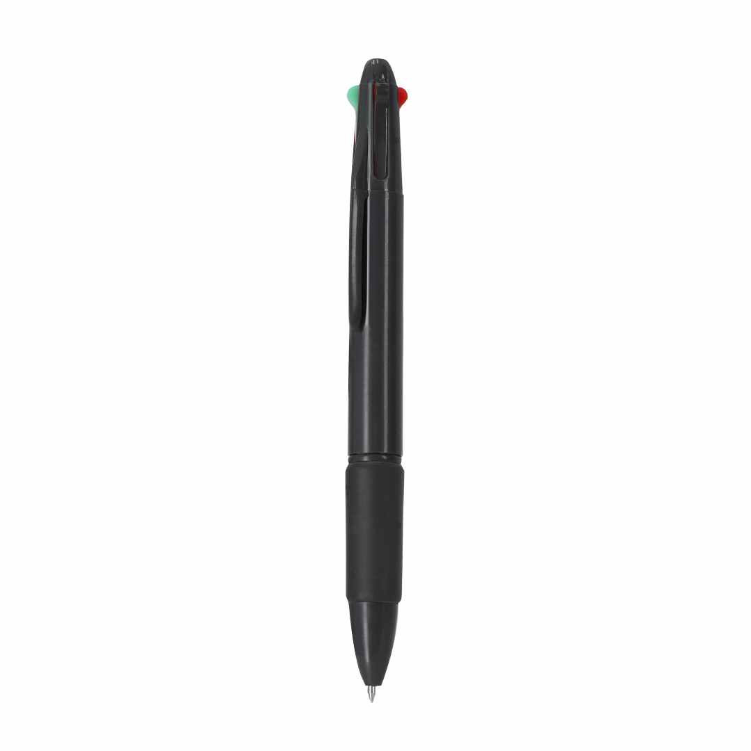 Deze 4-kleuren balpen is verkrijgbaar in verschillende kleuren en is afgewerkt met een zwart rubber deel. De pen is van ABS kunststof en heeft 4 verschillende kleuren inkt; Blauw, Rood, Groen of Zwart. De balpen is uitgevoerd met een push-mechanisme en soft ergonomische grip. We kunnen deze pennen voor u drukken met uw logo en/of tekst vanaf 250 stuks. Het maximale drukformaat is 45 mm breed en 7 mm hoog. Indien u de pennen zonder opdruk wilt bestellen dan kan dat ook vanaf 250 stuks. Deze balpen wordt vaak met veel plezier weggegeven op basisscholen.