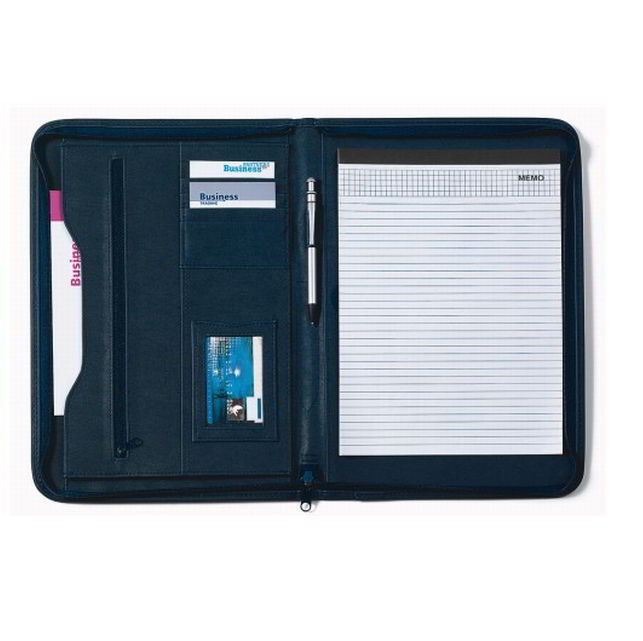 Schrijfmap / Documentenmap A4 met rits sluiting rondom. Deze A4 map is verkrijgbaar in zwart of blauw en bevat diverse insteekvakken.  De documenetnmap wordt zonder pen en schrijfblok geleverd. Uw logo kunnen wij drukken op de voorkant van de A4 map.