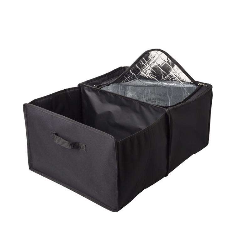 Volledig opvouwbare auto-organizer. Wanneer je deze uitvouwt dan heb je 2 compartimenten waarvan 1 compartiment een met rits afsluitbare koeltas is.  Aan de beide zijkanten is een handgreep aangebracht waardoor je de organiser in zijn geheel in- of uit de auto kunt pakken. We kunnen de organizer voor u bedrukken met uw reclame door middel van een digitaal geprinte transfer vanaf 10 stuks. Het aantal te drukken kleuren maakt dan voor de prijs niet uit. U kunt dan bij uw bestelling kiezen voor de drukdleur "full-Colour" Zonder opdruk kunt u deze tasjes vanaf  5 stuks bestellen.