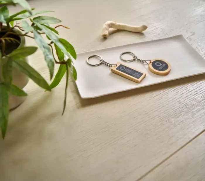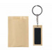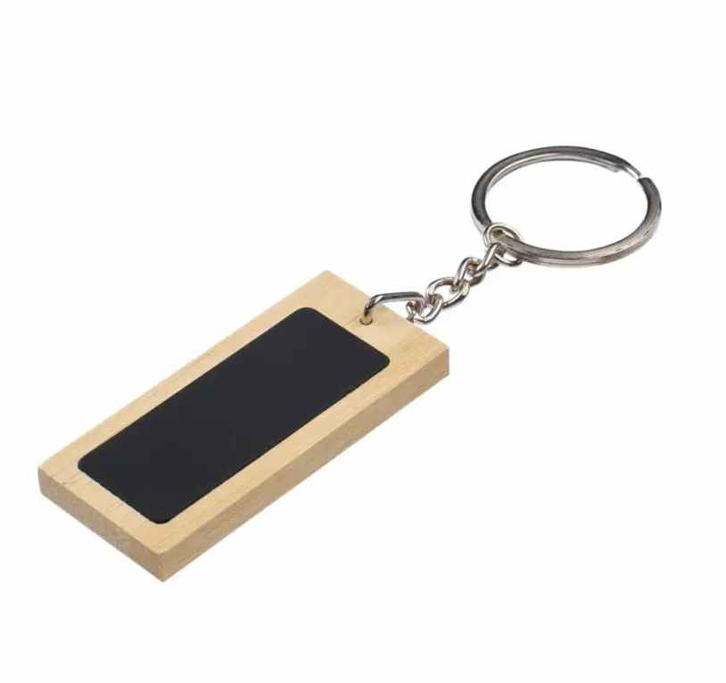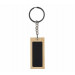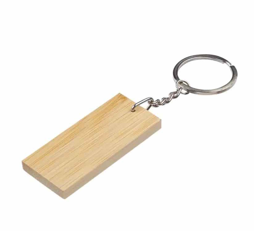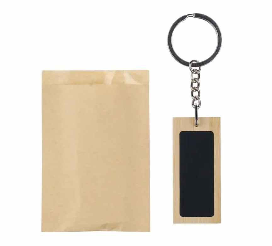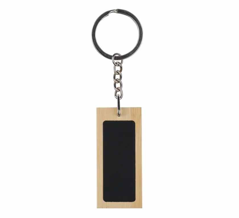 Rechthoekige sleutelhanger van Bamboe. Het zwarte deel is van metaal met een zwarte rubber coating. Uw logo kunnen wij hierop aanbrengen door middel van een lasergravure. Met een laserstraal wordt dan haarfijn de zwarte caoting weggebrand. Uw logo en/of tekst komt dan in glanzend chrome zichtbaar. Deze sleutelhangers worden per stuk verpakt geleverd in een bruin papiueren zakje. Indien u de sleutelhanger zonder opdruk wilt bestellen dan kan dat al vanaf 100 stuks.
