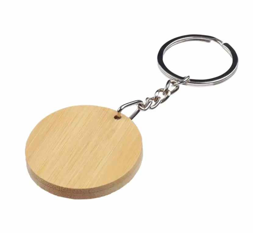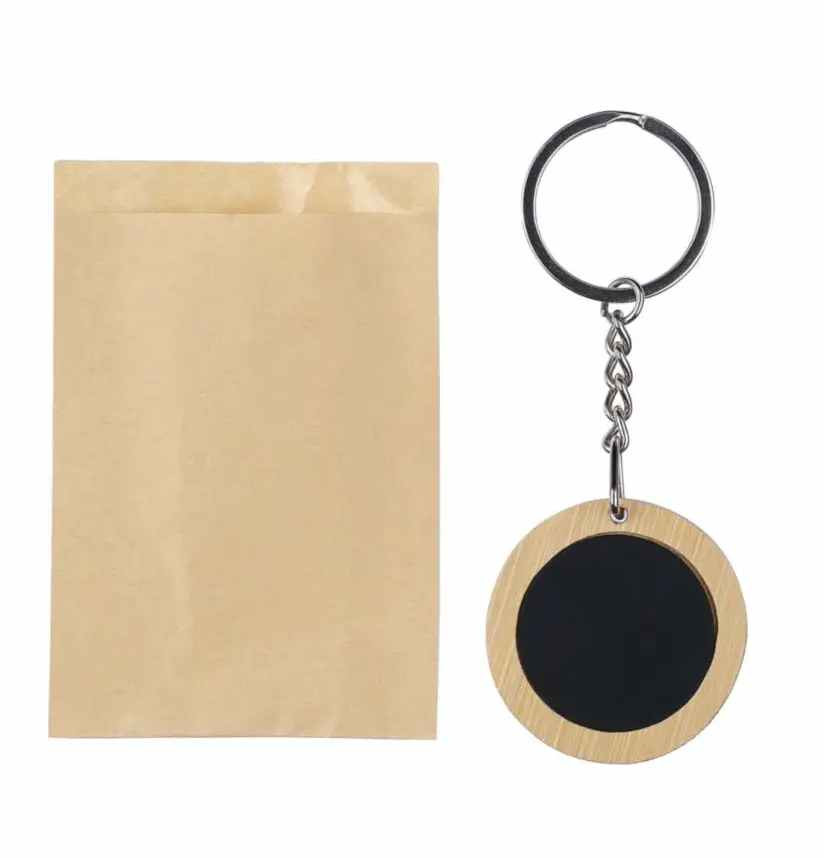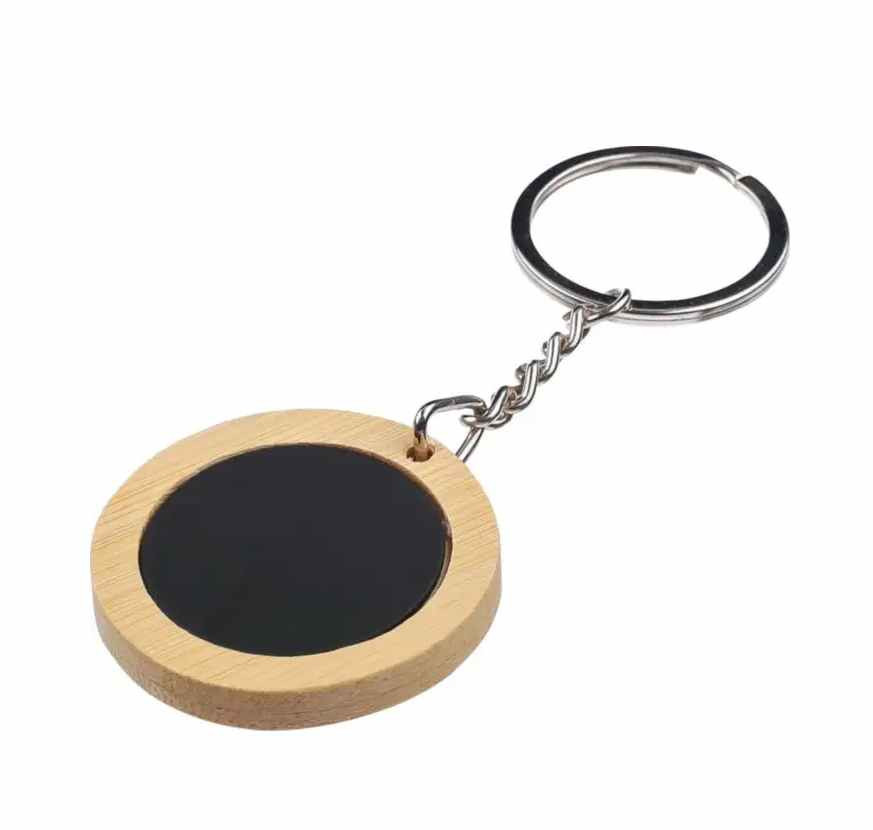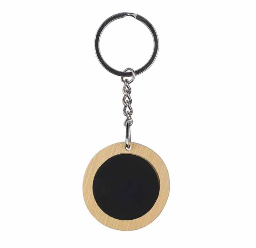 Ronde sleutelhanger van Bamboe. Het zwarte deel is van metaal met een zwarte rubber coating. Uw logo kunnen wij hierop aanbrengen door middel van een lasergravure. Met een laserstraal wordt dan haarfijn de zwarte caoting weggebrand. Uw logo en/of tekst komt dan in glanzend chrome zichtbaar. Deze sleutelhangers worden per stuk verpakt geleverd in een bruin papiueren zakje. Indien u de sleutelhanger zonder opdruk wilt bestellen dan kan dat al vanaf 100 stuks.