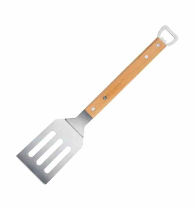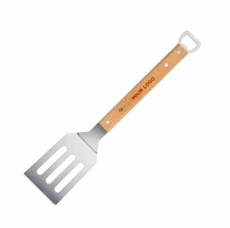 Barbeque spatel van RVS en een handvat van beukenhout. Aan de top van het handvat is een flesopener aangebracht. Deze spatel kunnen wij voor u lasergraveren met uw logo en/of reclametekst. U kunt de Barbequespatel zonder logo bestellen vanaf 15 stuks. Dit artikel wordt per stuk verpakt geleverd in een kartonnen doosje.