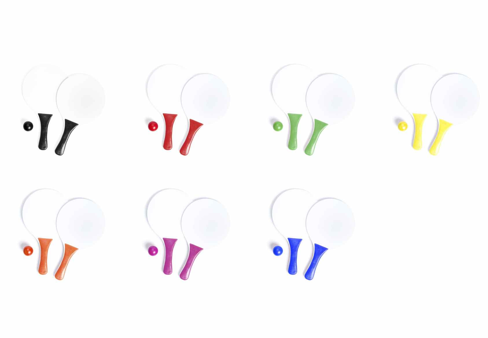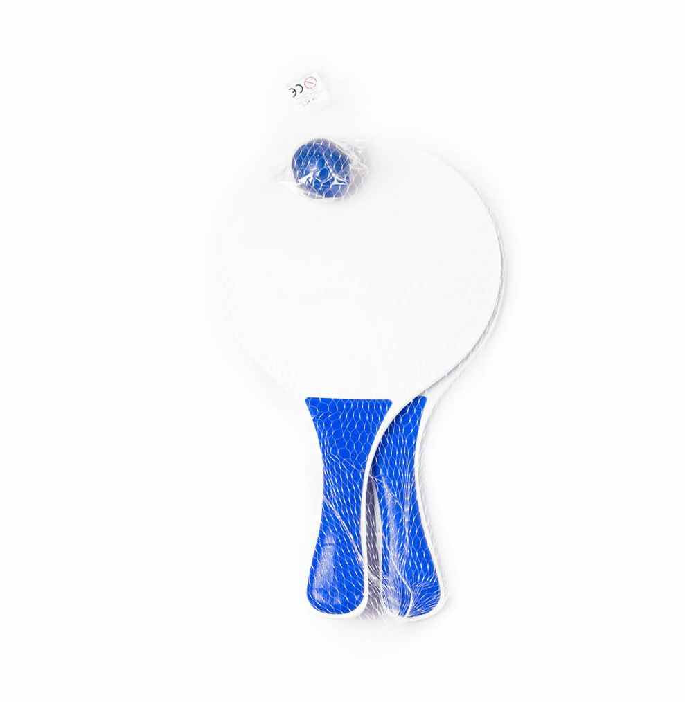 Houten beach tennissetje. Bestaande uit 2 rackets met een witte bat en een gekleurd handvat. Samen met de bal als set verpakt in een netje. De rackets hebben een versterkt handvat. We bedrukken uw logo standaard op 1 racket in maximaal 1 drukkleur. Wanneer u op beide rachets gedrukt wilt hebben dan kunt u dat aangeven in de kolom "opmerkingen". U kunt dit leuke strandspel ook zonder opdruk bestellen. De minimale afname zonder opdruk is 50 stuks