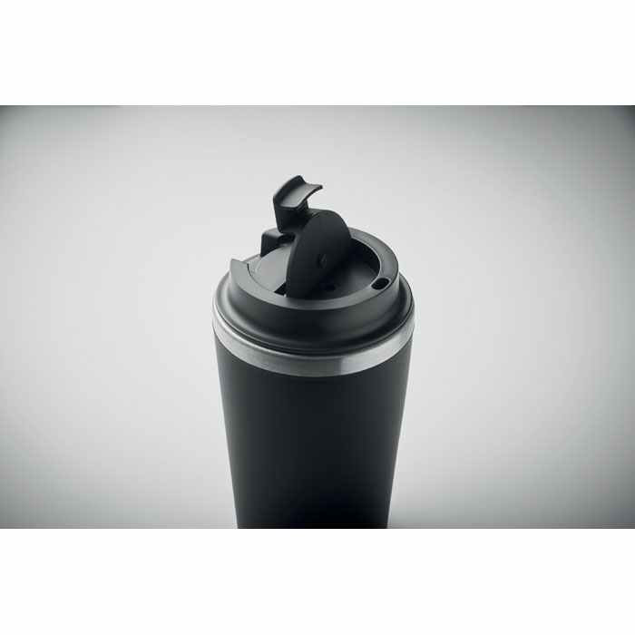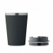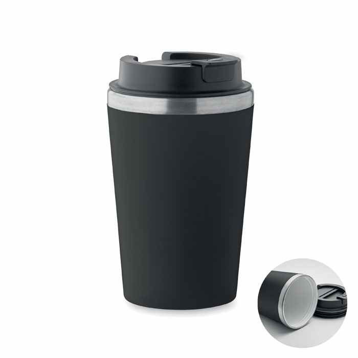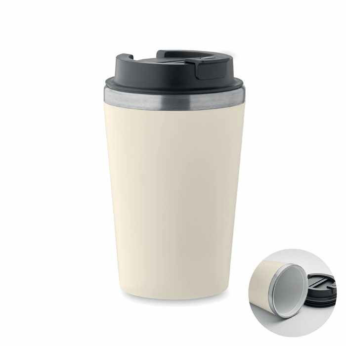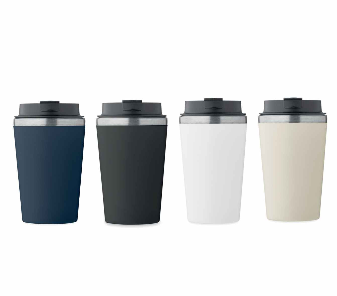 Mooie dubbelwandige drinkbeker met een buitenkant van PP kunststof en een binnewand van Gerecycled Roestvrij Staal. (10% RVS en 90% Gerecycled RVS) de binnzijde van de beker is voorzien van een keramische laag. Deze bekers zijn absoluut lekvrij en hebben een inhoud van 350 ml. Uw logo kunnen wij drukken op de beker. Je kunt ze ook zonder opdruk bestellen. De minimale afname is dan 12 stuks.