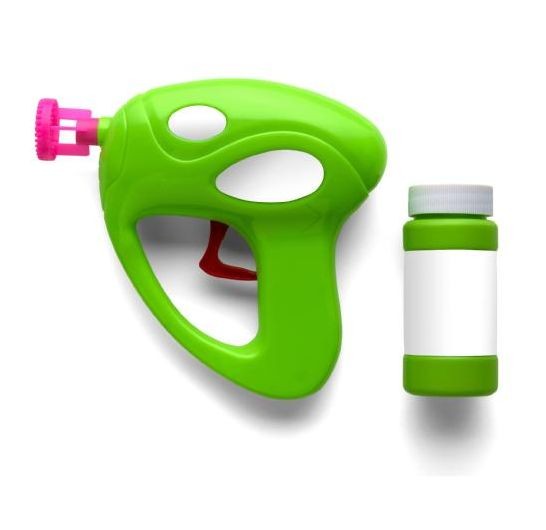 Leuk bellenblaas apparaat voor de kinderen. Giet wat bellenblaas vloeistof in de deksel van het potje. Doop het tuitje in de bellenblaas vloeistof en knijp de trekker in. Wordt geleverd met 0,05 L vloeistof.