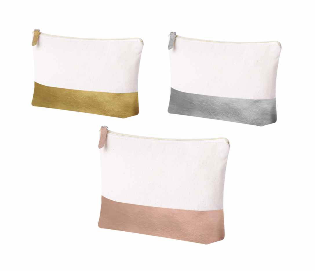 Toilettasje / Cosmeticatasje in 2 kleuren uitgevoerd. Deze cosmeticatasjes zijn van katoen en afgewerkt met PU-leer in metallic kleur. We kunnen dit leuke tasje voor u bedrukken in 1- of meerdere drukkleuren. U kunt de tasjes zonder opdruk bestellen vanaf 50 stuks.