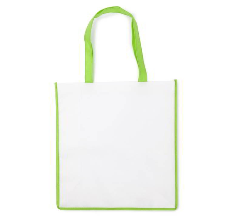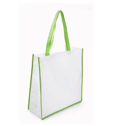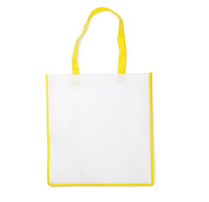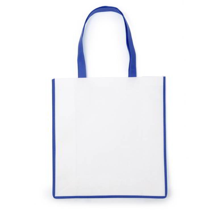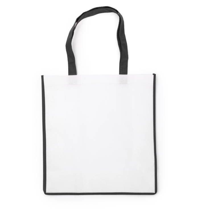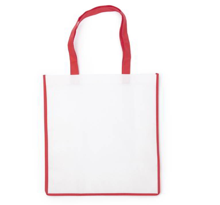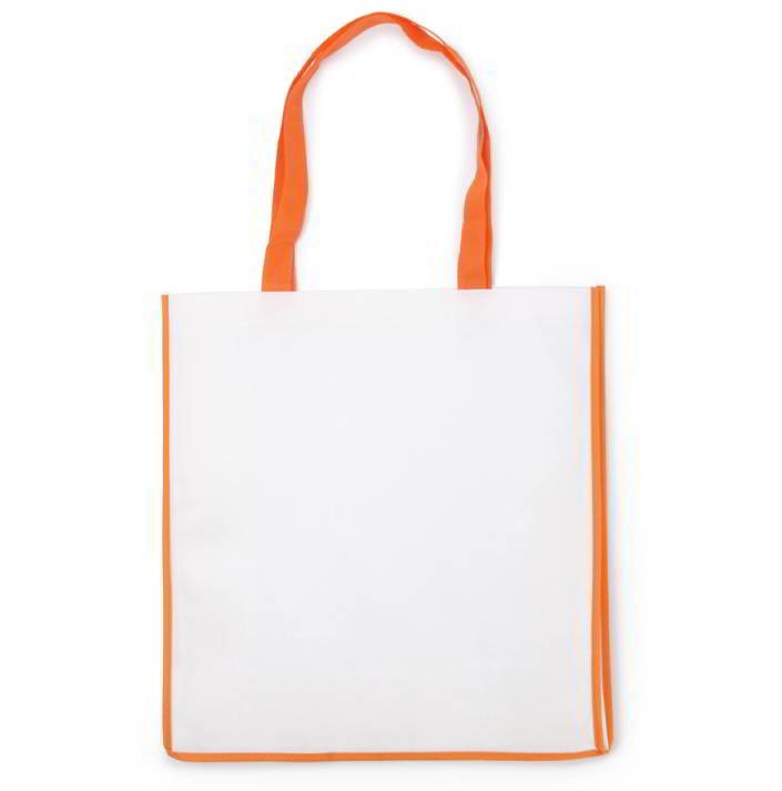 Draagtassen in een witte basiskleur met een gekleurde bies en hengsels. Deze tassen zijn gemaakt van N0n-Woven materiaal. Indien u deze tas zonder opdruk wilt bestellen is de minimale afname 50 stuks.