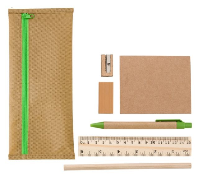 Etui van NonWoven materiaal in Eco style. Dit euit wordt geleverd met een liniaaltje, potlood, punteslijper, balpen, gum en een schrijfblokje. een perfect geschenk voor bijvoorbeeld de kinderen in de basisschoolleeftijd. We kunnen uw logo en/of tekst eventueel drukken op het etui. Indien u dit leuke geschenk zonder opdruk wilt bestellen dan kan dit vanaf 50 stuks.
