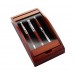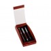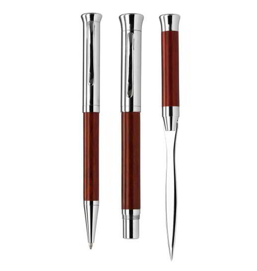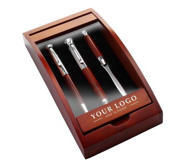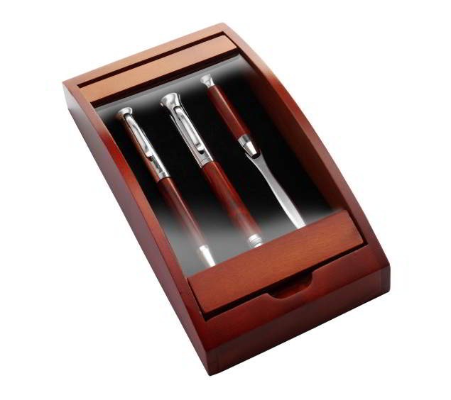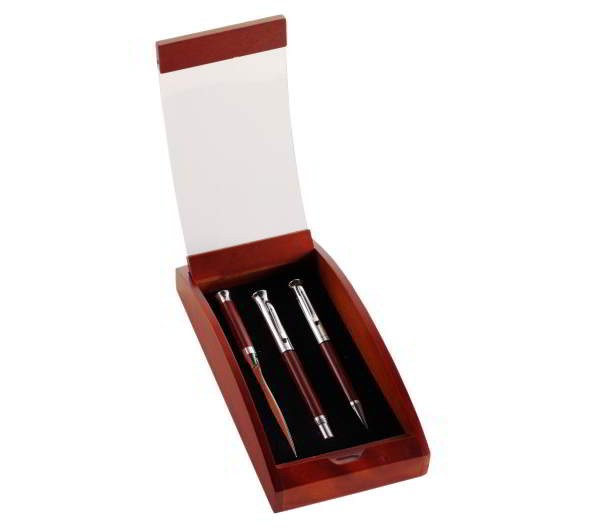 Deze rozenhouten pennenset bestaat uit een Balpen met zwarte inkt en een vulpen met zwarte inkt. Tevens een briefopener. Deze luxe set zit verpakt in een mooie houten doosje met transparante deksel. Uw logo bedrukken wij op het doosje. U kunt deze set ook zonder opdruk bestellen. De minimale afname is dan 2 stuks.