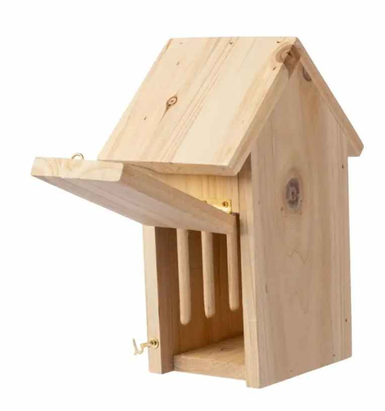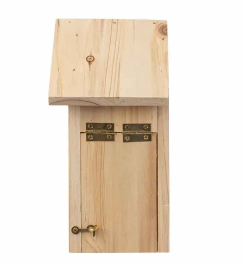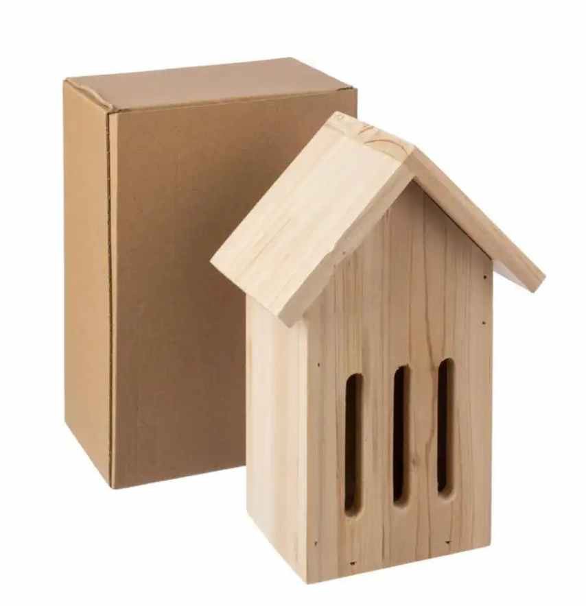 Houten Vlinderhuis van Grenen. Het vlinderhuis heeft een afmating van 14 x 10 x 20 cm. De drie openingen aan de voorzijde zijn voor vlinders onweerstaanbaar. Hang het huisje op met de metalen ophanghaak en er zullen snel vlinders in overnachten.  Dit leuke artikel wordt geleverd in een bruin kartonnen doosje. Uw logo kunnen wij bedrukken op het huisje.   Indien u dit vlinderhuisje zonder opdruk wilt bestellen dan kan dit al vanaf 10 stuks.