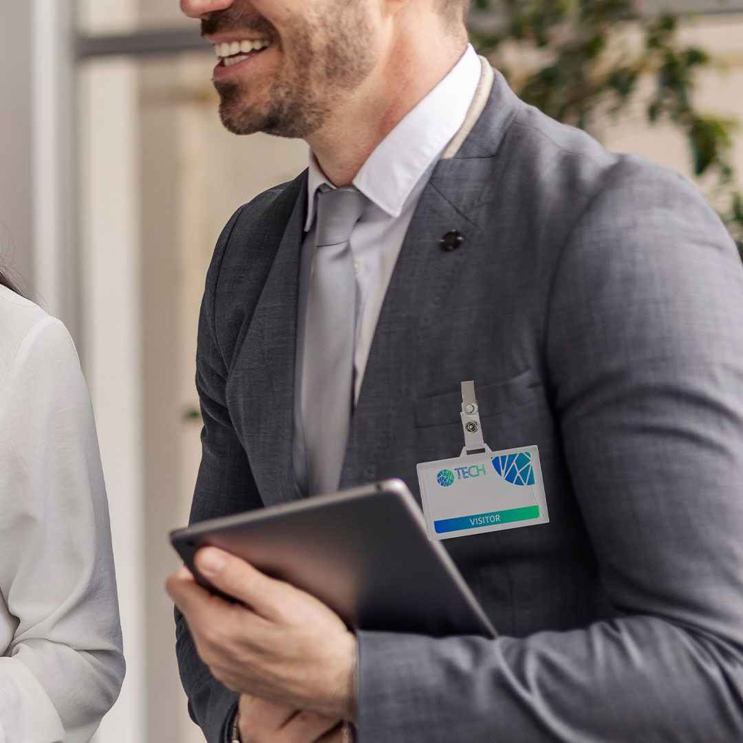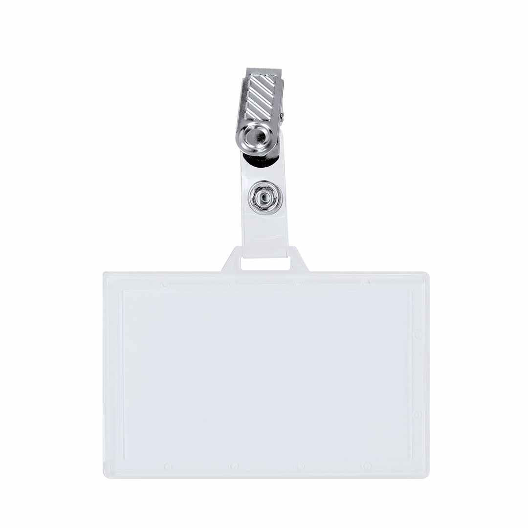 Naambadge met clip of knijper. Deze badgehouder is van hard kunststof en geschikt om uw ID-pas in te schuiven. De pashouder is horizontaal (Landscape) U kunt dezelfde pashouder op deze site ook bestellen in verticale (Portrait) stand. Zie artikel 85492. Met de knijper clip is deze gemakkelijk aan uw kleding bevestigen. Deze pashouder is 9,4 x 6,6 x 0,4 cm. We kunnen aan de onderrand van de voorzijde of achterzijde uw reclame drukken. Het drukformaat is daar maximaal 60 mm breed en 8 mm hoog. U kunt de pashouders ook zonder uw opdruk bestellen. De minimale afname is 100 stuks.