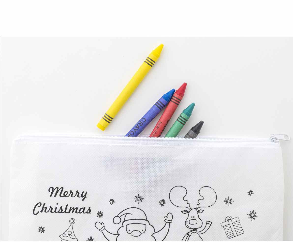 Etui voor kinderen om zelf te kleuren. Dit etui wordt geleverd met de 5 kleurtjes zoals deze staan afgebeeld. Dit witte etui is van NonWoven materiaal en heeft een afmeting van 228 x 120 mm. Wij kunnen uw tekst en/of logo bedrukken op 1 zijde op het witte vlak boven de kleurafbeeldingen. We kunnen dit artikel voor u bedrukken in 1- of meerdere drukkleuren. Voor de prijs maakt het niet uit in hoeveel kleuren uw logo gedrukt moet worden. Wanneer u bij uw bestelling dan kiest voor 1 drukkleur en daarna kiest u de drukkleur "full-color" dan drukken wij uw logo in meerdere kleuren terwijl u slechts voor 1 drukkleur betaald. U kunt deze etui's ook zonder opdruk bestellen vanaf 150 stuks.