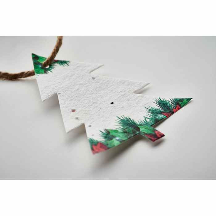 Deze kersthanger in de vorm van een kerstboom is gemaakt van zaadpapier met een jute ophangtouwtje. Na gebruik plant u het papier in een bloempot of in de tuin. Daar groeit dan een variatie van bloemen uit. Zo geniet u 2 x van dit kerstgeschenkje. Deze leuke kerstbal kunnen wij voor u drukken met uw logo en/of tekst. De kerstbal is ook zonder opdruk te betsellen. De minimale afname zonder opdruk is dan 100 stuks.
