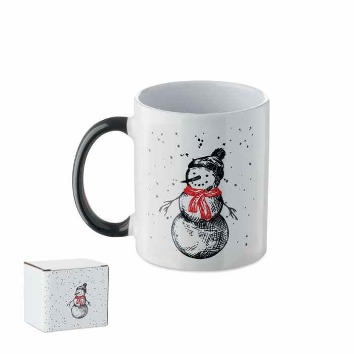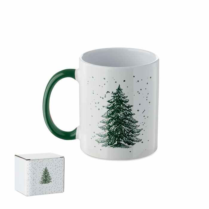 Kerstmok verkrijgbaar in verschillende uitvoeringen. Deze mok heeft een afmeting van 9,6 cm hoog en 8 cm doorsnede. De inhoud is ca. 300 ml. Iedere mok wordt per stuk verpakt geleverd in een bijpassend kartonnen doosje. U kunt deze mokken dus gemakkelijk als cadeautje weggeven. De mokken zijn standaard van een kerstmotief voorzien. De rode mok is met een kerstsok, De groene mok met een kerstboom, De zwarte met een Rendier, De rood/zwarte met een sneeuwpop en de wit/rode met een kerstman. Uw logo kunnen wij bedrukken op de andere zjde van de mok. U kunt deze mokken ook zonder uw eigen logo bestellen. De minimale afname is dan 24 stuks.