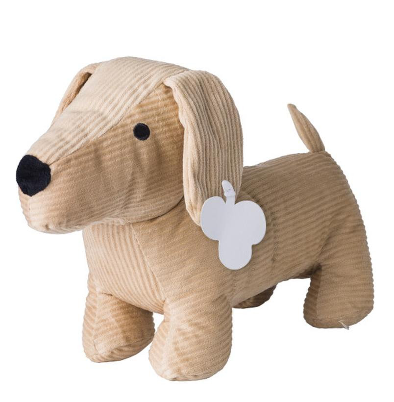 Knuffel HOND in de vorm van een Teckel. De oogjes van dit hondje zijn veilig geborduurd. (geen kraaltjes). Aan de hond zit standaard een kartonnen label. Hierp kunnen wij uw logo drukken in maximaal 2 kleuren. Indien u deze pluche liever zonder opdruk besteld dan kan dat ook. de minimale afname zonder opdruk is 10 stuks.
