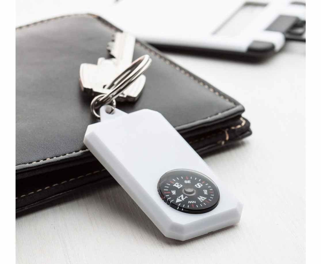 Kompas sleutelhanger. Deze sleutelhanger is 30 x 55 x 9 mm en bestaat uit een wit kunststof plaatje met daarin een kompasje en met een metalen ring. We kunnen deze sleutelhanger voor u bedrukken met uw logo vanaf 100 stuks. Indien u de kompassen zonder logo wilt bestellen dan kan dat ook vanaf 100 stuks.
