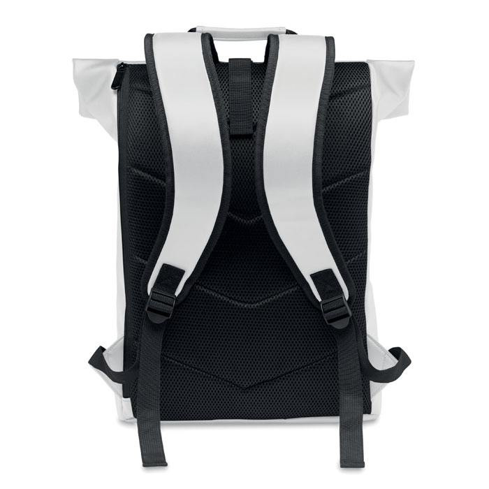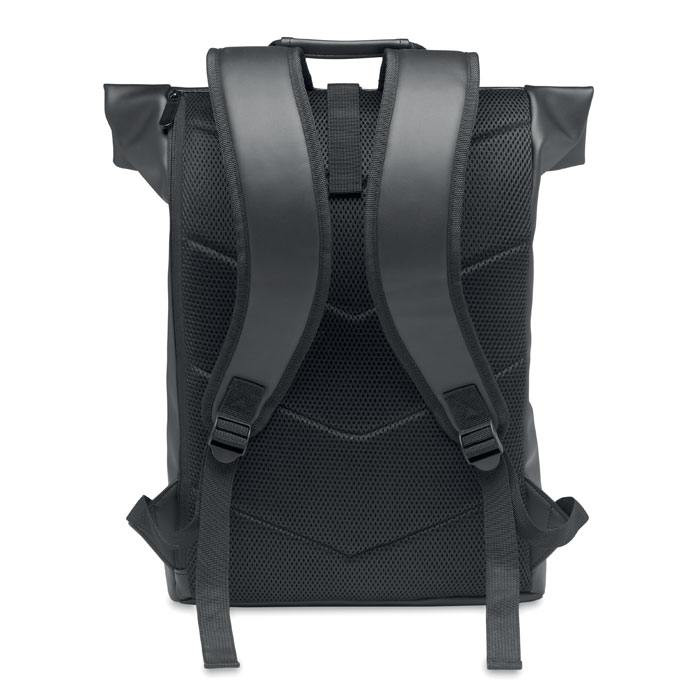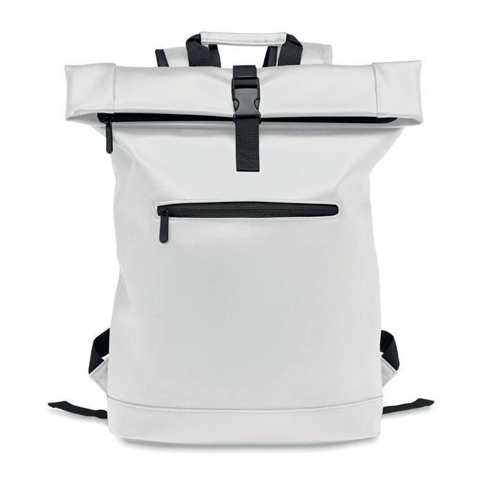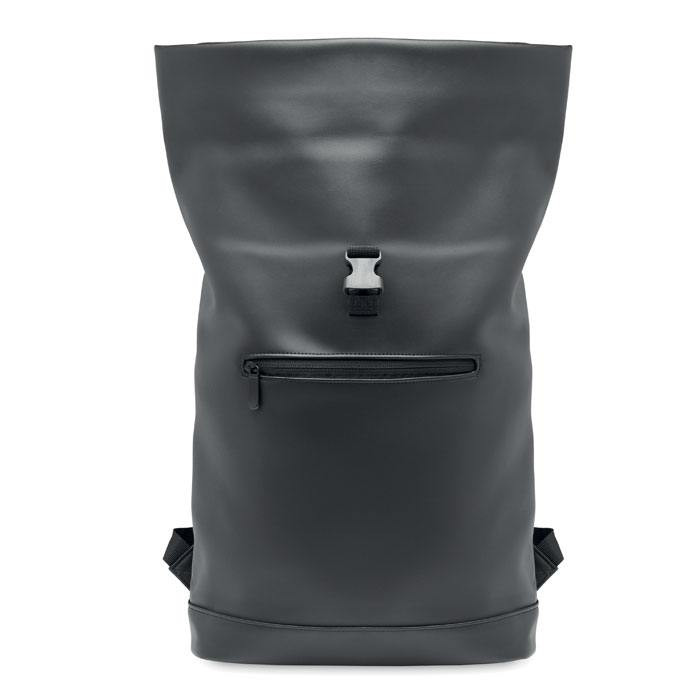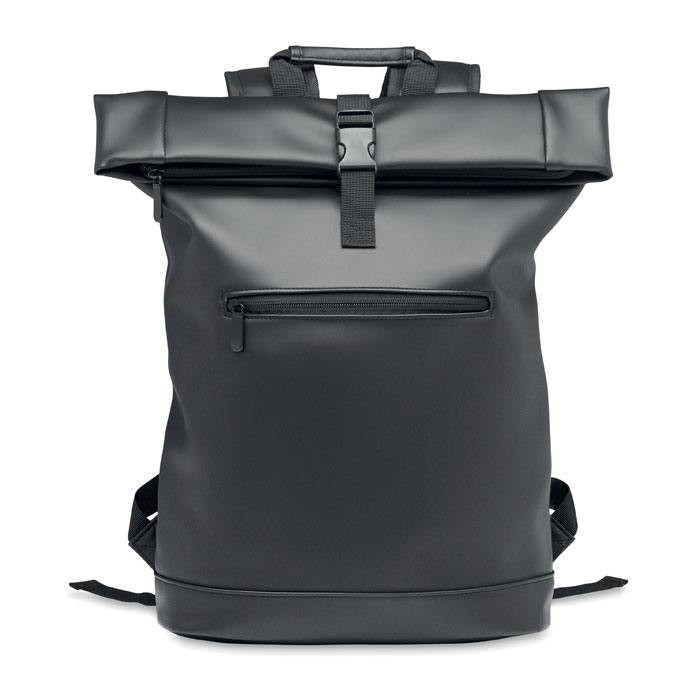 Laptop rugzak van zacht PU materiaal in een zogenaamde Rolltop uitvoering. Je laptop (tot maximaal 15 inch) zit goed en veilig opgeborgen in deze rugzak. De bodem is verstevigd en de achterkant gewatteerd. Het voorvak is afsluitbaar met een rits. De voering is gemaakt van 210D RPET> We kunnen de Laptoptas/Rugtas voor je bedrukken met een logo en/of tekst in maximaal 1 drukkleur. Indien u dit artikel zonder opdruk wilt bestellen dan kan dat al vanaf 5 stuks.