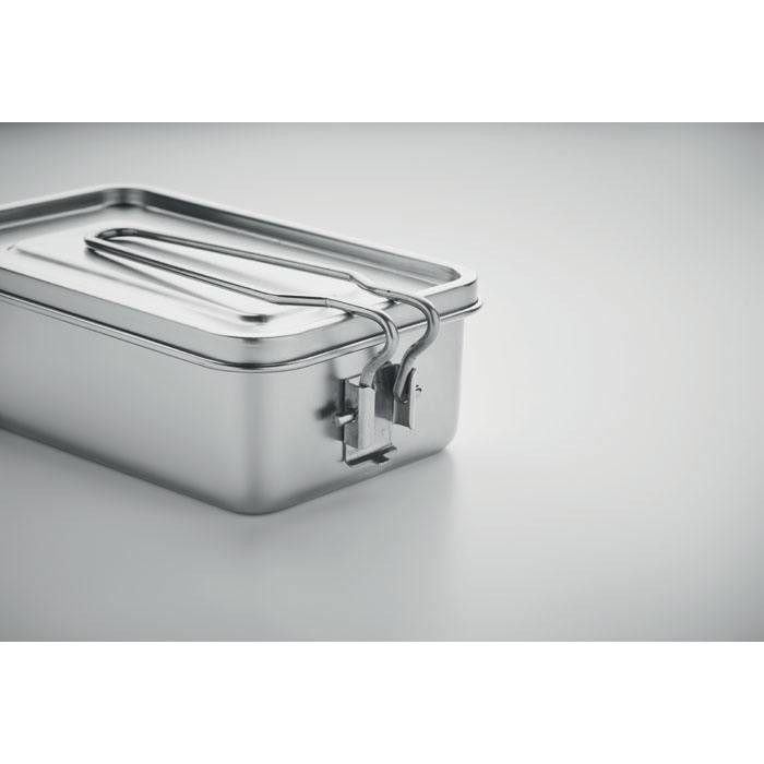 Lunchbox Broodtrommel van RoestVrij Staal. Het handvat is afneembaar. Deze lunchbox heeft een afmeting van 18 x 11 x 6 cm. Inhoud 750 ml. We kunnen de metalen broodtrommel voor u voorzien van uw logo d.m.v. een lasergravure. U kunt deze ook zonder opdruk bestellen. De minimale afname is dan 10 stuks.