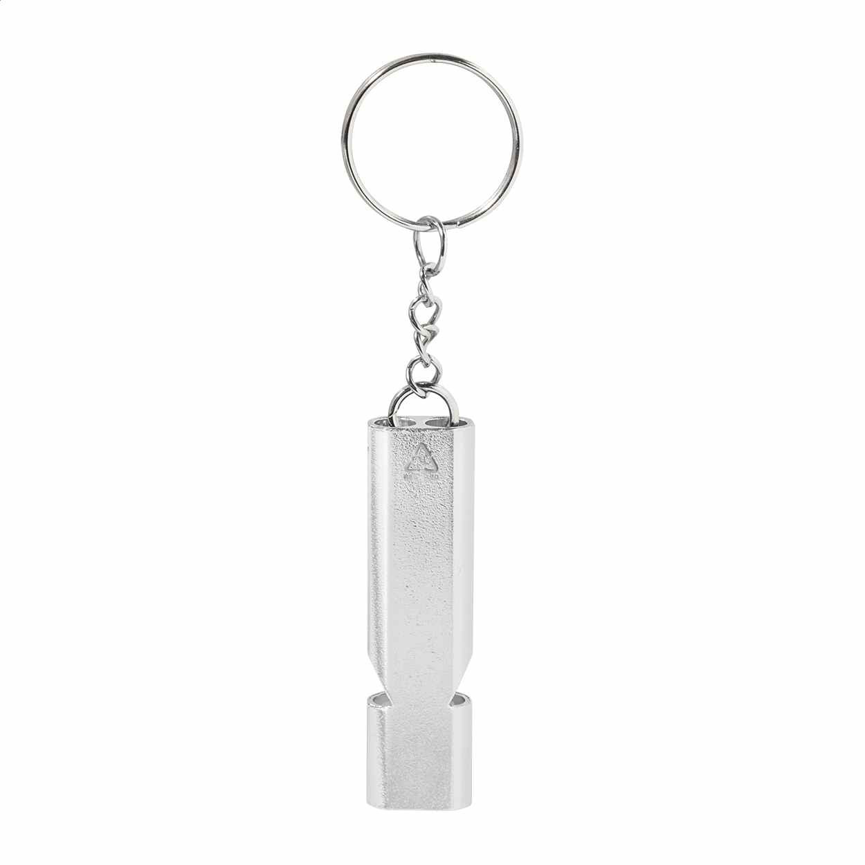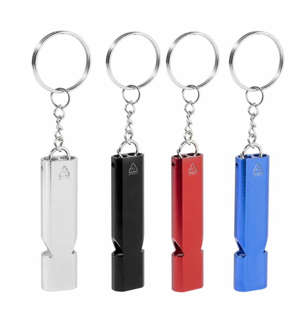 Sleutelhanger met een metalen fluitje. Dit fluitje is gemaakt van gerecycled aluminium. We kunnen deze fluitjes van uw reclame voorzien door middel van een lasergravure. Indien u de metalen fluitjes lieverzonder opdruk besteld dan kan dat ook. De minimale afname is dan ook 100 stuks.
