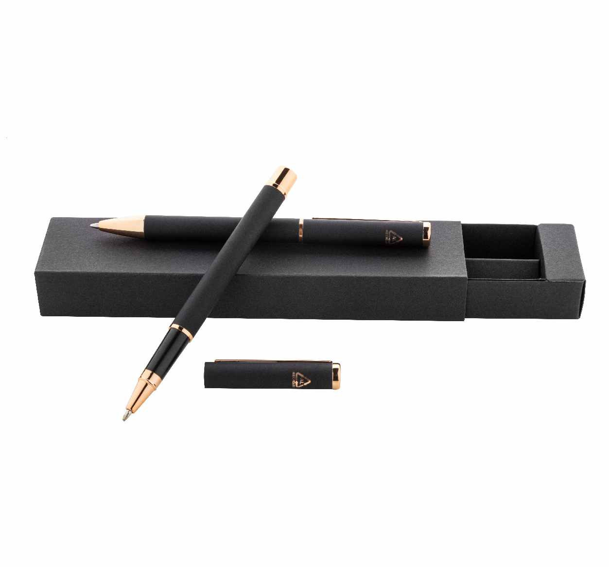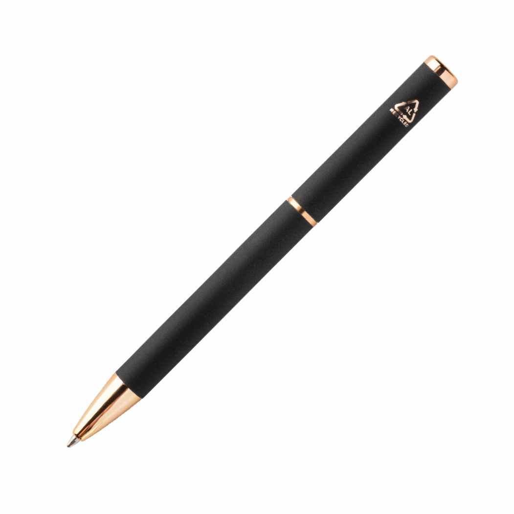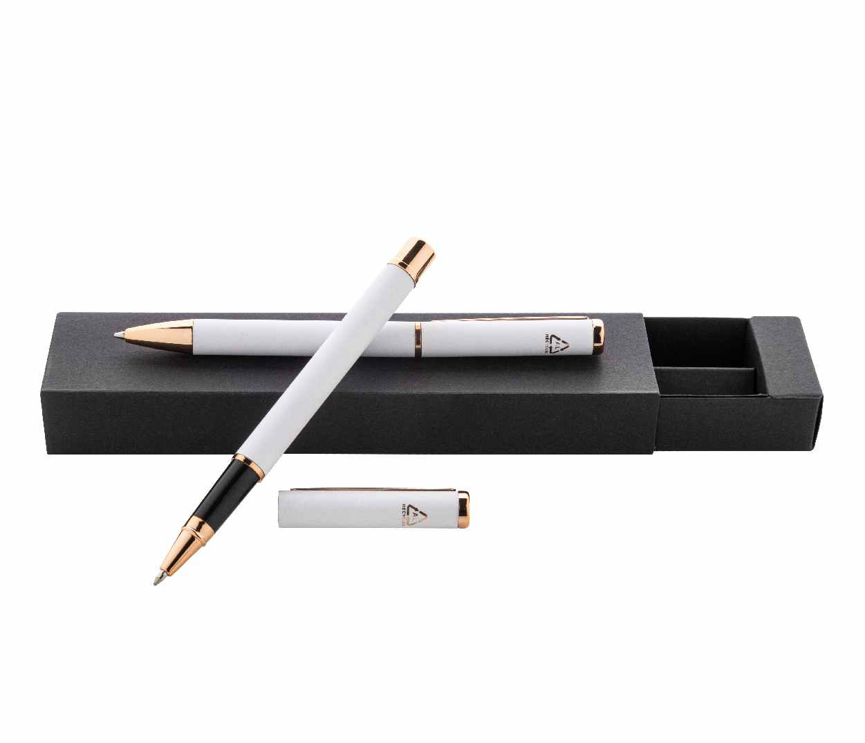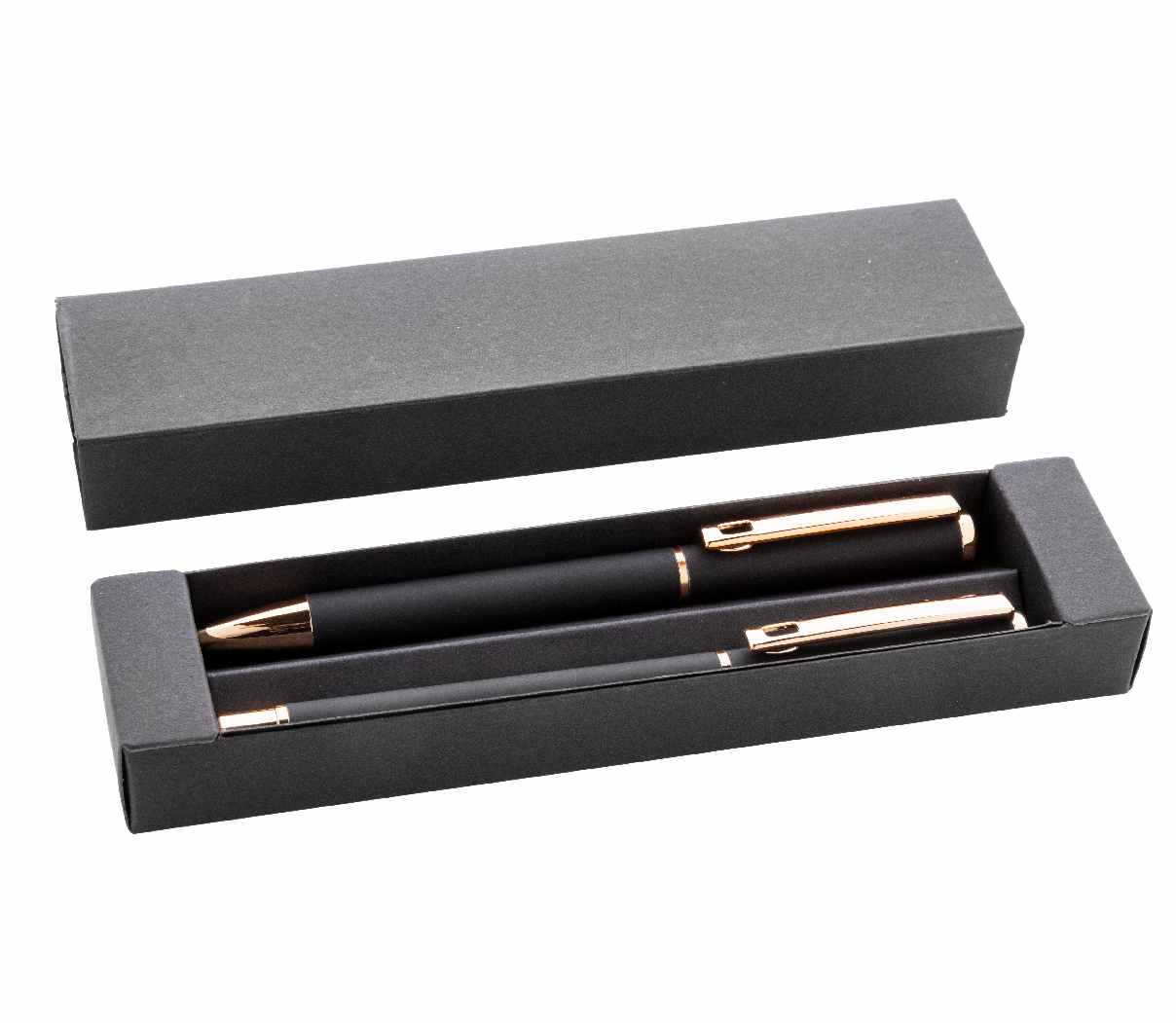 Deze metalen penneset is van gerecycled aluminium en verkrijgbaar in verschillende kleuren. De pennenset bestaat uit een balpen en een rollerbal waarbij de pen is afgewerkt met roségouden details. De pennen zijn verpakt in een zwart geschenkdoosje. Wordt geleverd met blauwe navulling. De pennen kunnen wij van uw logo voorzien d.m.v. een lasergravure op het metalen gedeelte naast de clip. Uw logo wordt dan in de kleur roségoud zichtbaar. We kunnen de pennen ook eventueel in kleur drukken. Indien u het in kleur gedrukt wilt hebben, dan kunt u dat aan ons laten weten. Dit relatiegeschenk kunnen wij eventueel ook van individuele namen voorzien. Dit maakt dit geschenk nog persoonlijker! Indien u hiervan gebruik wilt maken dan kunt u dat melden bij uw bestelling in de kolom "opmerkingen". Wij nemen dan contact met u op om de mogelijkheden met u te bespreken. Indien u deze pennenset zonder opdruk wilt bestellen dan kan dat ook al in de kleine oplage van 10 stuks.