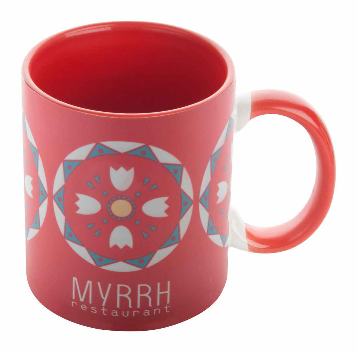 Deze mok kunnen wij rondom voor u bedrukken met uw logo, maar naast uw logo ook met individuele namen. Met een eigen naam wordt de mok nog persoonlijker. We kunnen deze mok voor u bedrukken in 1- of meerdere drukkleuren. Voor de prijs maakt het niet uit in hoeveel kleuren uw logo gedrukt moet worden. Wanneer u bij uw bestelling dan kiest voor 1 drukkleur en daarna kiest u de drukkleur "full-color" dan drukken wij uw logo in meerdere kleuren terwijl u slechts voor 1 drukkleur betaald. De mok heeft standaard een witte buitenkant en een gekleurde binnenkant. ook het oor van de mok is in dezelfde kleur als de binnenkant. De mok is 10 cm hoog en heeft een diameter van bijna 82 mm. Inhoud 350 ml. Iedere mok wordt per stuk verpakt geleverd in een geschenkdoosje. U kunt de mokken ook zonder opdruk bestellen vanaf 50 stuks.