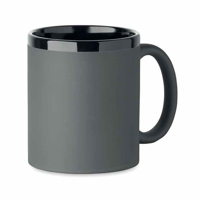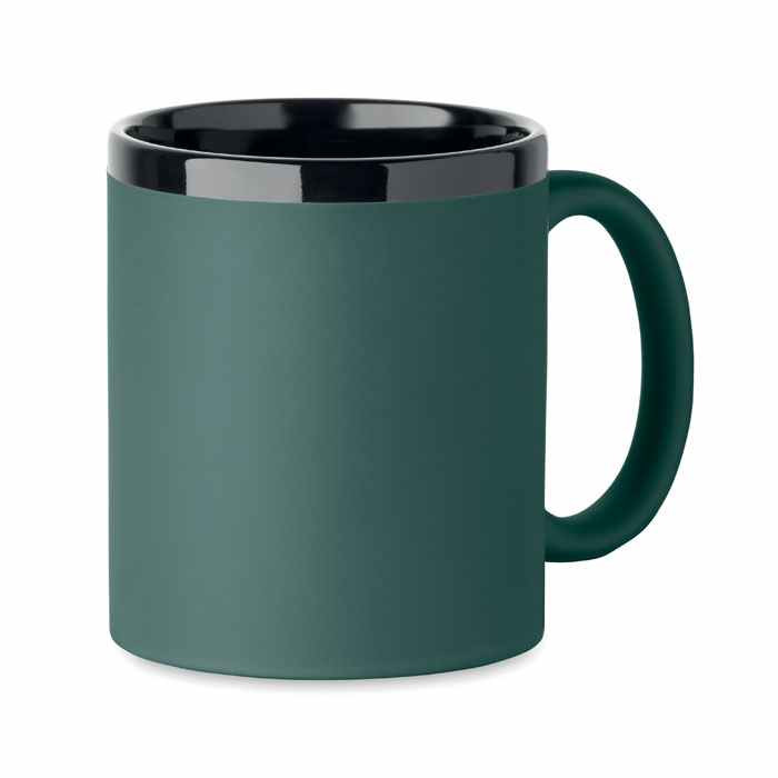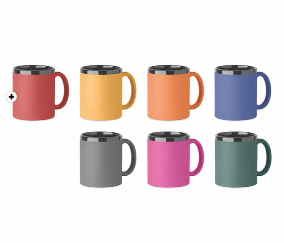 Mooie keramische mok met een mat gekleurde soft touch afwerking aan de buitenkant van de beker. De binnenkant en de rand is tandaard zwart. Deze mok heeft een inhoud van ca. 300 ml. De mok wordt per stuk verpakt gelever in een neutraal wit doosje. Uw logo kunnen wij aanbrengen door middel van een lasergravure. Met een laserstraal wordt dan de gekleurde buitenlaag weggehaald waardoor uw logo en/of tekst in wit zichtbaar wordt. Het voordeel hievan is dat uw logo altijd zichtbaar blijft. Ook na vele malen afwassen in de vaatwasser. Indien u deze mokken liever zonder opdruk wilt bestellen dan kan dat al vanaf 24 stuks. .