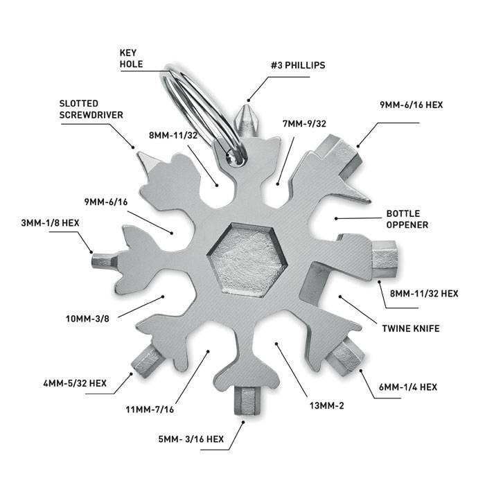 Multitool van RVS. Deze multitool bevat maar liefst 17 verschillende functies en kan aan uw sleutelbos gehangen worden. Een leuk promotieartikel voor de doe-het-zelver of voor in de techniek. Uw logo kunnen wij voor u lasergraveren in het midden van dit leuke stuk gereedschap. U kunt deze ook zonder opdruk bestellen vanaf 25 stuks.