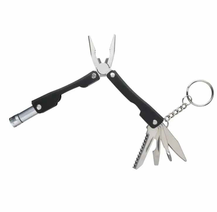 Sleutelhanger Multitool van RVS. Inklapbare tool met 10 verschillende functie's. Tevens een enkele LED lamp. Verpakt in een polyester hoesje van 600D met een klittenband sluiting. Het hoesje kan aan eeen broekriem bevestigd worden. Per stuk verpakt in een bruin kartonnen doosje. Uiteraard kunnen wij uw reclame drukken op dit artikel. het maximale drukformaat is beperkt; 40 x 3 mm. U kunt deze geschenkjes ook zonder opdruk bestellen, De minimale afname is dan 25 stuks.