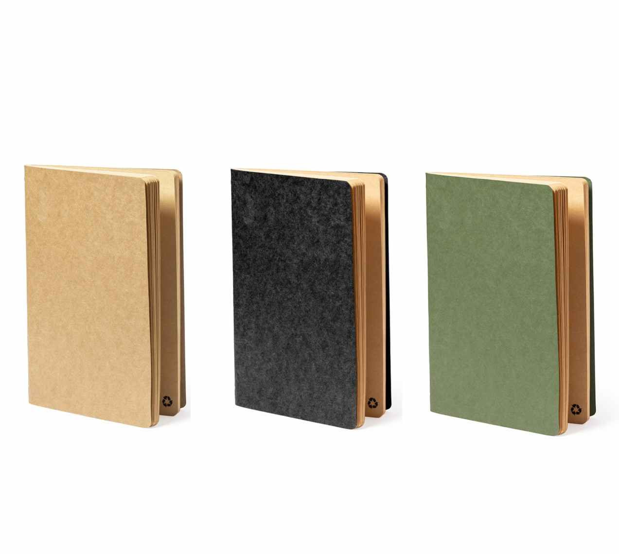 Notitieboek van volledig gerecycled papier en karton. it notitieboekje is i A5 formaat en heeft een zachte kartonnen kaft. De 60 notitieblaadjes zijn kraft afgewerkt en zijn blanco. Dus geen lijntjes of ruitjes. Op ieder blaadje zit standaard het recycle logo. Uw logo kunnen we op de kaft bedrukken in maximaal 1 kleur zeefdruk. U kunt deze natuurlijke notitieboejes ook zonder opdruk bestellen vanaf 100 stuks.