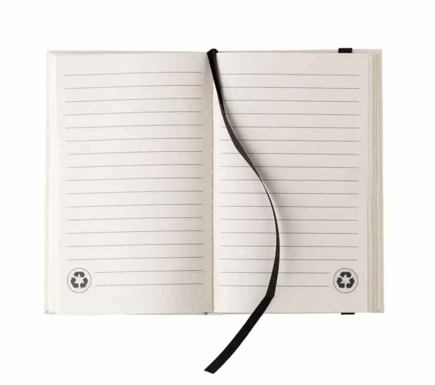 Deze A6 formaat notitieboekjes zijn gemaakt van gerecyclede melkpakken. 70% gerecyclede melkpakken en 30% gerecycled papier. Op de voorzijde staat dan ook standaard het logo ingestanst dat dit van gerecyclede melkpakken is gemaakt. Zie een foto hieronder. Het boekje bestaat uit 80 vellen en heeft een leeslint en een elastische sluitband. Uw logo kunnen wij full-colour drukken op de voorkant van dit notitieboekje. We kunnen dit artikel voor u bedrukken in 1- of meerdere drukkleuren. Voor de prijs maakt het niet uit in hoeveel kleuren uw logo gedrukt moet worden. Wanneer u bij uw bestelling dan kiest voor 1 drukkleur en daarna kiest u de drukkleur "full-color" dan drukken wij uw logo in meerdere kleuren terwijl u slechts voor 1 drukkleur betaald. U kunt deze notitieboekjes ook zonder opdruk bestellen. Dat kan al in een kleine oplage van 25 stuks.