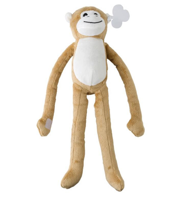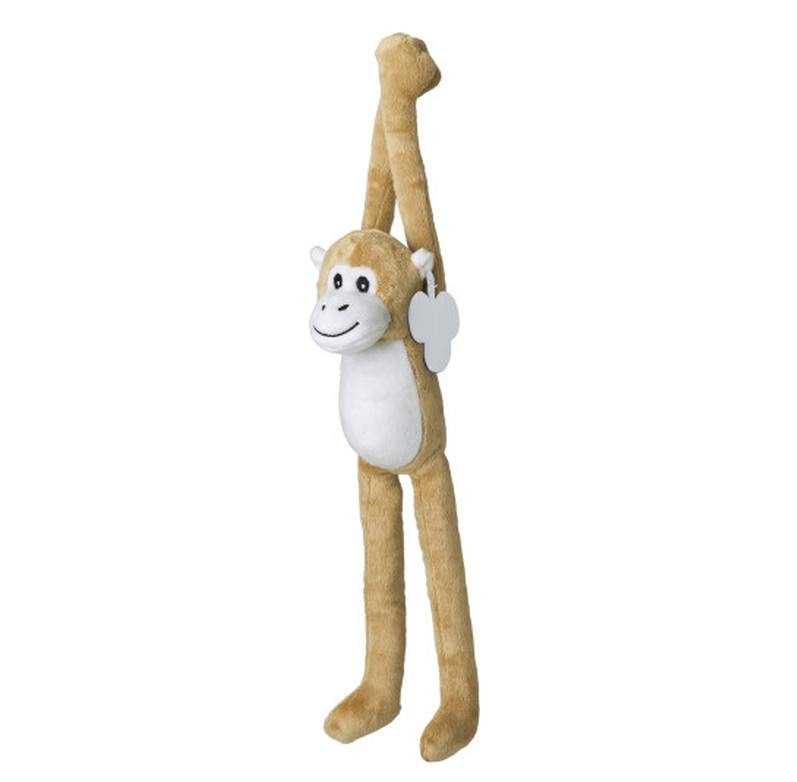 Pluche Aapje met extra lange armen en een klittebandsluiting. De oogjes van dit pluche aapje zijn veilig geborduurd. (geen kraaltjes). Aan het aapje zit standaard een kartonnen label. Hierp kunnen wij uw logo drukken in maximaal 2 kleuren. Indien u deze pluche liever zonder opdruk besteld dan kan dat ook. de minimale afname zonder opdruk is 20 stuks.