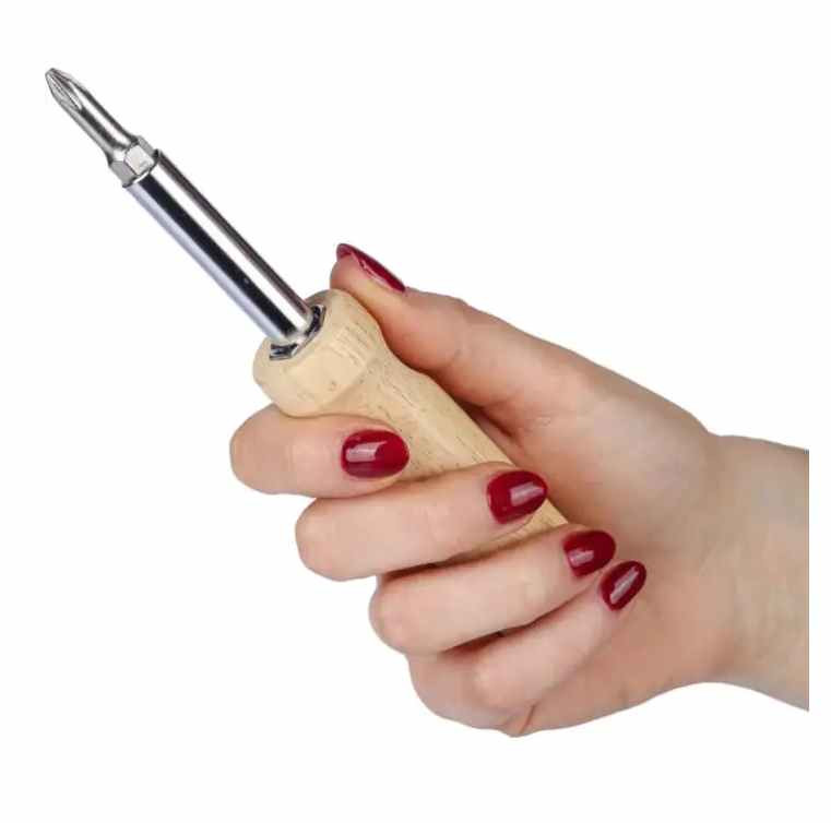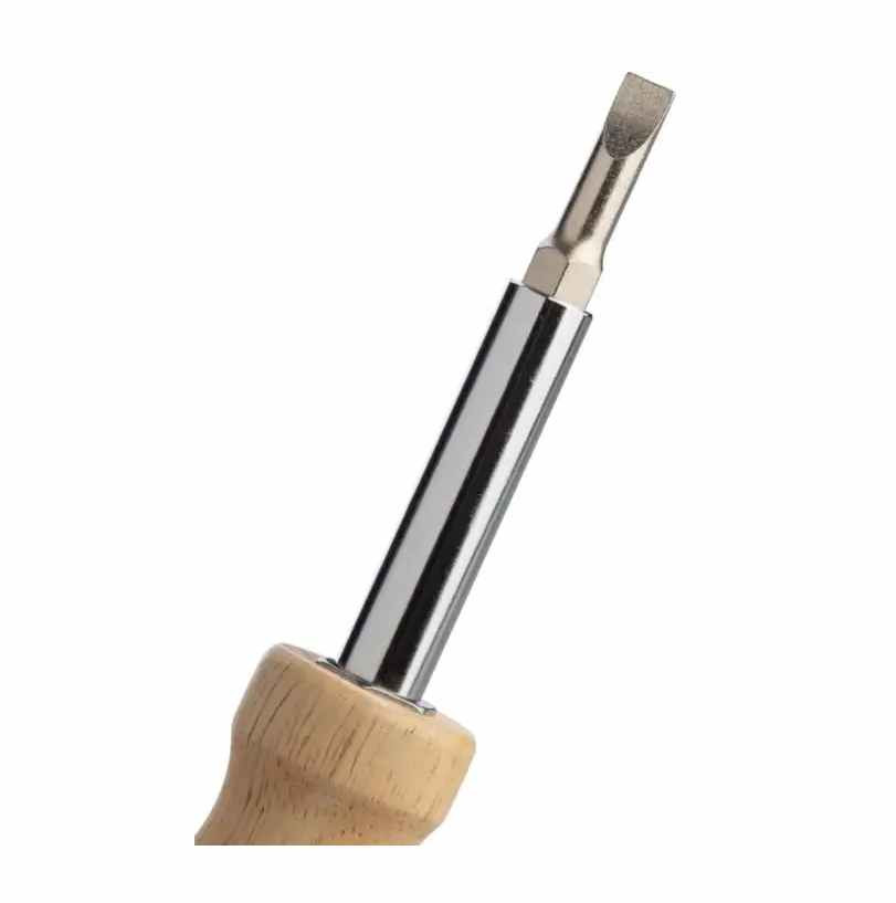 Schroevendraaier met een handvat van Rubberhout. Deze schroevendraaier bevat 4 bitjes die magnetisch zijn. (twee op elke dubbelzijdige pin) De bitjes zijn in het handvat opgeborgen. Dit leuke ontwerp is een echte weggever in een technische branche. We kunnen uw logo aanbrengen op het houten hadvat d.m.v. een lasergravure. U kunt deze ook zonder logo bestellen vanaf 20 stuks. de schroevendraaier wordt per stuk verpakt geleverd in een bruin kartonnen doosje.
