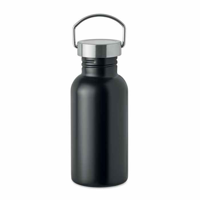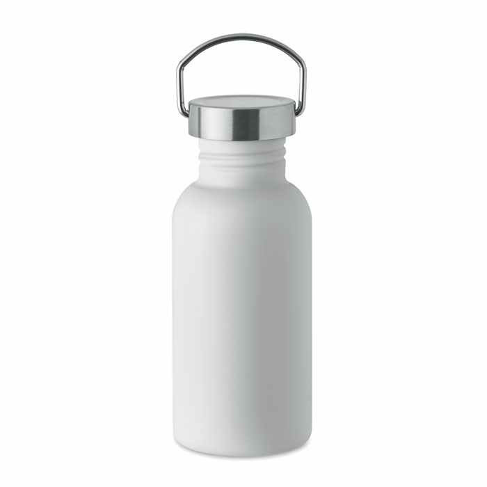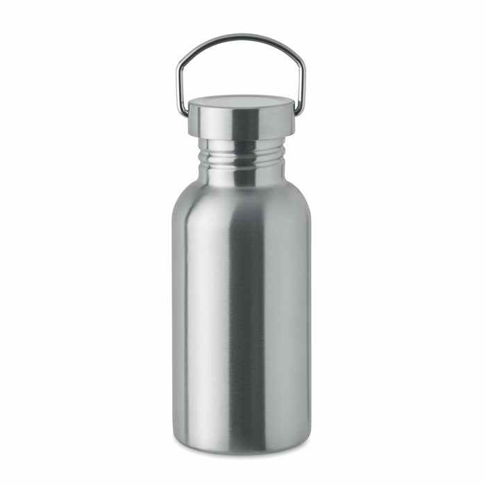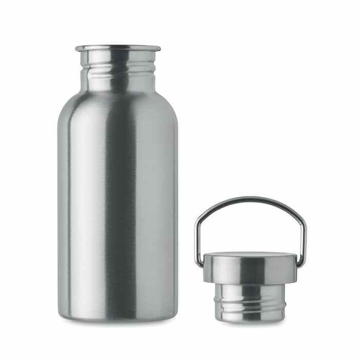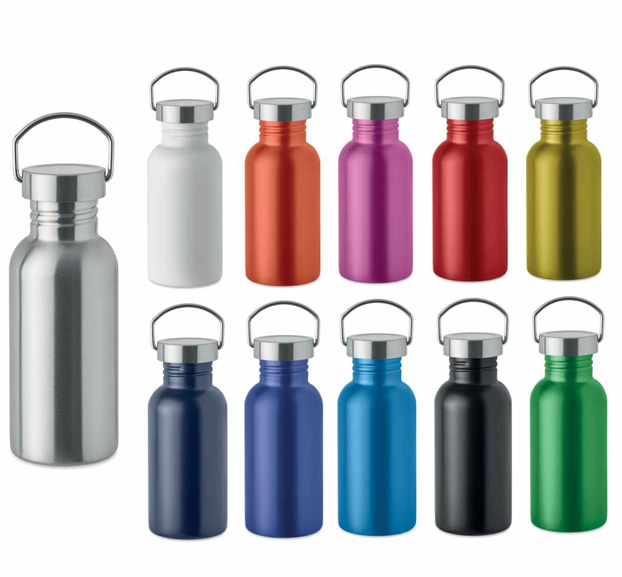 Mooie enkelwandige drinkfles van Roestvrij Staal. Gemaakt van 90% gerecuycled RVS en 10% RVS) Voorzien van een draaidop met lus. Volledig lekvrij afsluitbaar. De inhoud van deze fles is 500 ml. Afmeting van de fles is 18 cm hoog en 7 cm doorsnede. We kunnen deze flessen van uw logo voorzien door middel van een digitale full-colour opdruk rondom de fles. Je kunt ze ook zonder opdruk bestellen. De minimale afname is dan 12 stuks.
