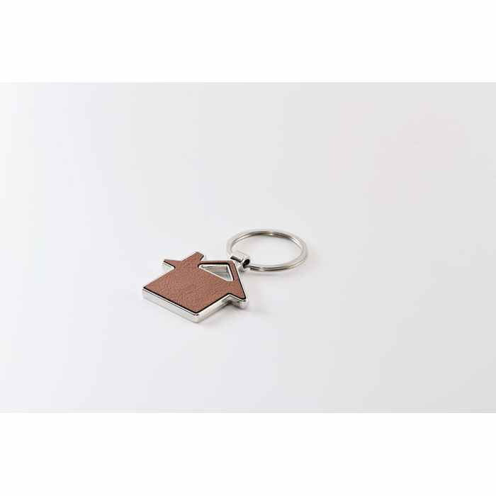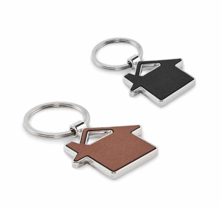 Metalen Sleutelhanger in model van een huisje. Deze sleutelhanger is ingelegd met PU-leer. Uw logo kunnen wij aanbrengen door middel van een lasergravure in het leer. Uw logo wordt dan met een laserstraal verdiept aangebracht. Dat zit er heel fraai uit. Iedere sleutelhanger is per stuk verpakt in een doosje. U kunt hem dan echt als een geschenk weggeven.  Leuk weggevertje voor bijvoorbeeld een ANDelaar of in de vastgoed.