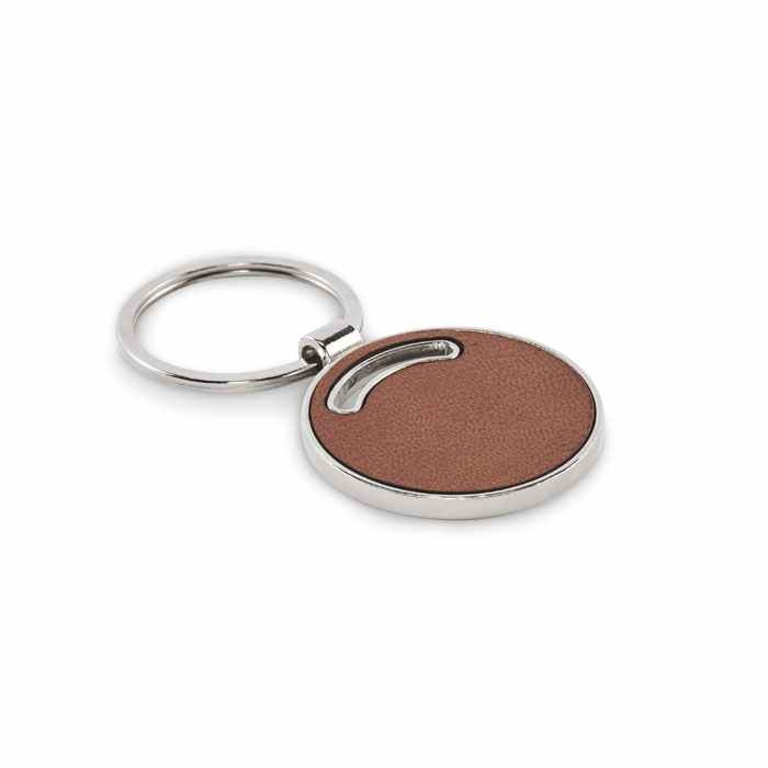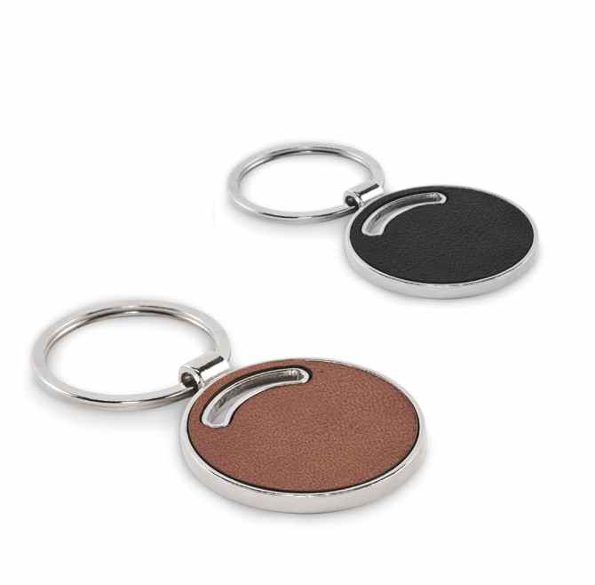 Metalen Sleutelhanger in een rond model. Deze sleutelhanger is ingelegd met PU-leer. Uw logo kunnen wij aanbrengen door middel van een lasergravure in het leer. Uw logo wordt dan met een laserstraal verdiept aangebracht. Dat zit er heel fraai uit. Iedere sleutelhanger is per stuk verpakt in een doosje. U kunt hem dan echt als een geschenk weggeven.