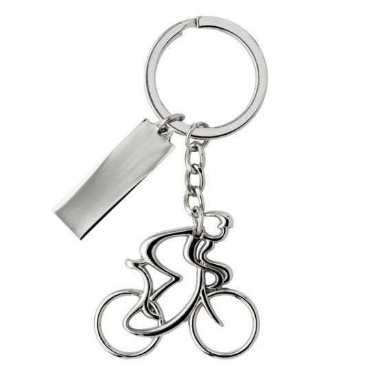 Deze sportieve sleutelhanger is voorzien van een wielrenner met racefeiets. Tevens is aan de metalen ring een label gemonteerd waarop wij uw reclame kunnen lasergraveren. Dit artikels is per stuk verpakt in een zwart geschenkdoosje.