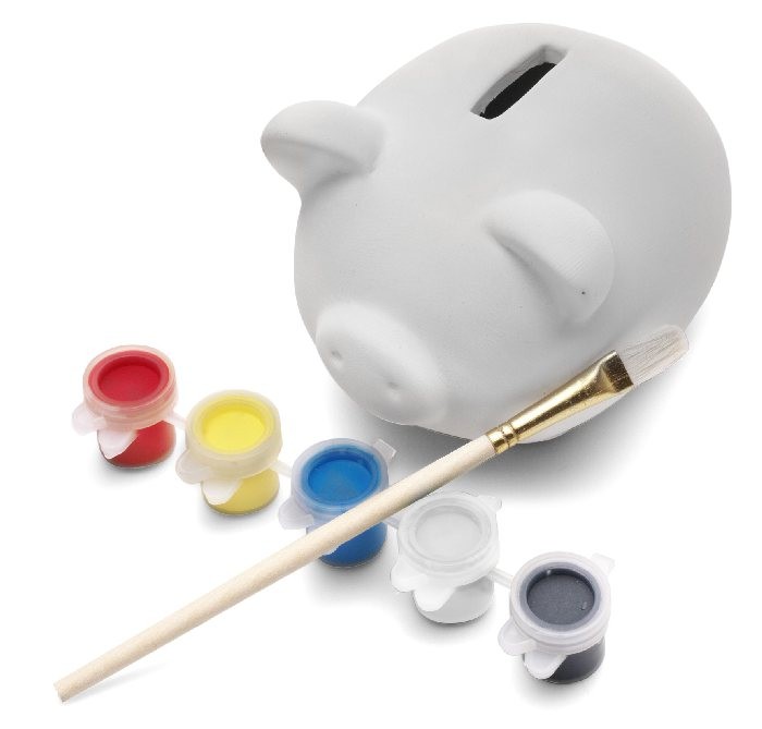 Spaarvarken van Gips met 5 verfpotjes en een kwast om zelf het varkentje te schilderen. Dit artikel kan niet bedrukt worden.