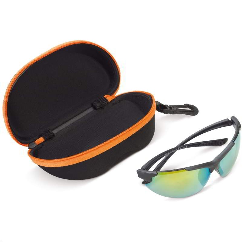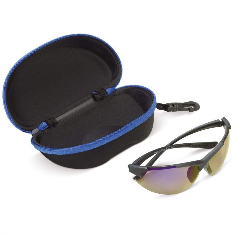 Sportzonnebril met gespiegelde glazen met UV400 bescherming. De zonnebril wordt geleverd met een stevig EVA beschermdoos. Deze zonnebril is ook perfect als fietsbril te gebruiken. We kunnen deze bedrukken met 1 kleur op 1 pootje van de bril.