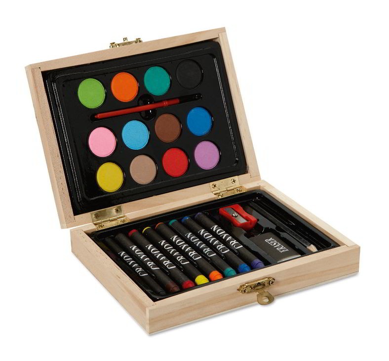 Mini tekenset houten doosje met 8 krijtjes, 12 waterverfkleuren, 1 kwast, 1 puntenslijper, 1 gum en een potlood. Het doosje heeft een afmeting van 15,5 x 15 x 3,2 cm