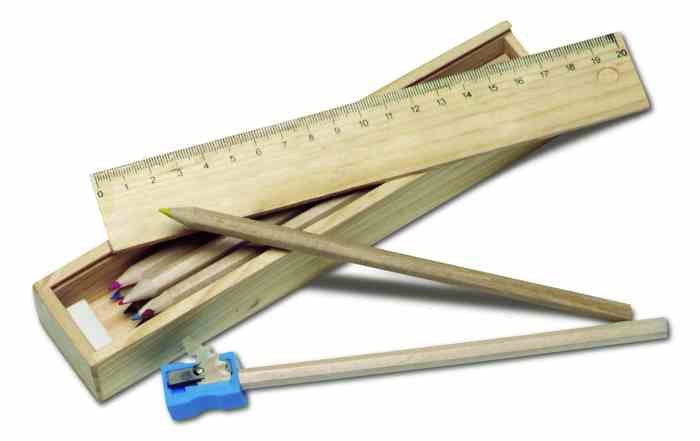 Tekenset met houten kleurpotloden, puntenslijper, lineaal en gum. Verpakt in houten kistje
