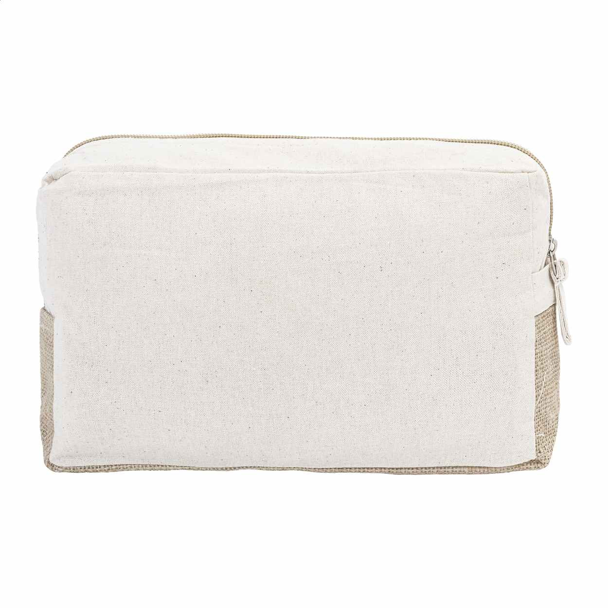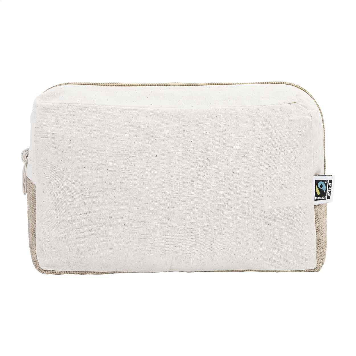 Fairtrade Toilettas / Makeup tas van katoen met gelamineerde jute. Aan iedere toilettas zit standaard een label met het fairtradelogo gestikt. Gemaakt van 100% fairtrade katoen 180 g/m². Deze toilettas kunnen wij voor u bedrukken met uw logo door middel van een digitaal geprinte transfer.Voor de prijs maakt het niet uit in hoeveel kleuren uw logo gedrukt moet worden. Wanneer u bij uw bestelling dan kiest voor 1 drukkleur en daarna kiest u de drukkleur "full-color" dan drukken wij uw logo in meerdere kleuren terwijl u slechts voor 1 drukkleur betaald. Dit geschenk kunnen wij eventueel ook van individuele namen voorzien. Dit maakt dit geschenk nog persoonlijker! Indien u hiervan gebruik wilt maken dan kunt u dat melden bij uw bestelling in de kolom "opmerkingen". Wij nemen dan contact met u op om de mogelijkheden met u te bespreken. Indien u de fairtrade toilettas zonder opdruk wilt bestellen dan kan dat al vanaf 50 stuks.