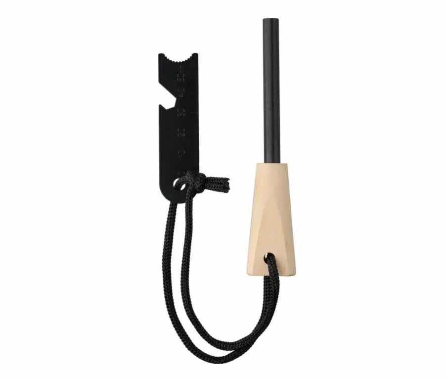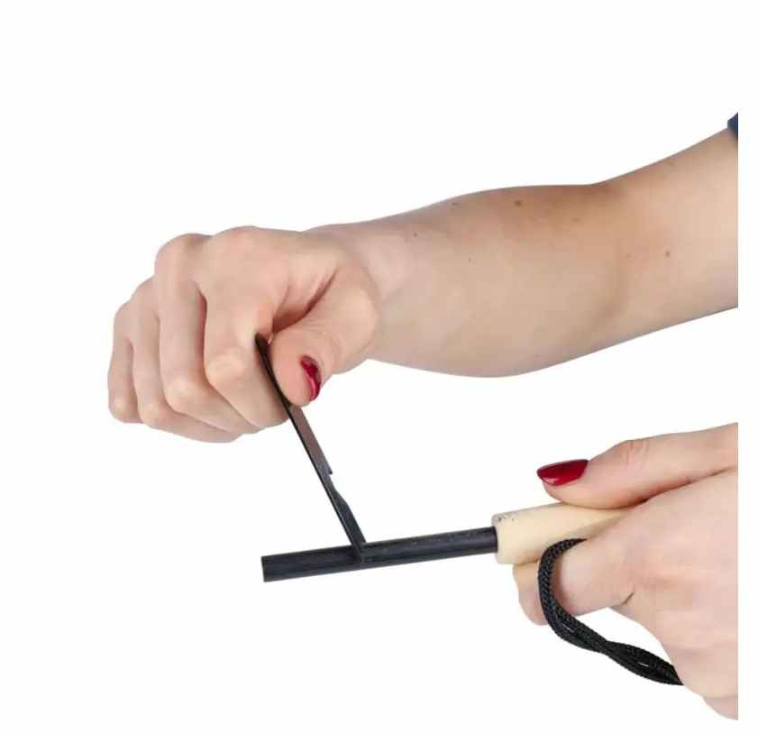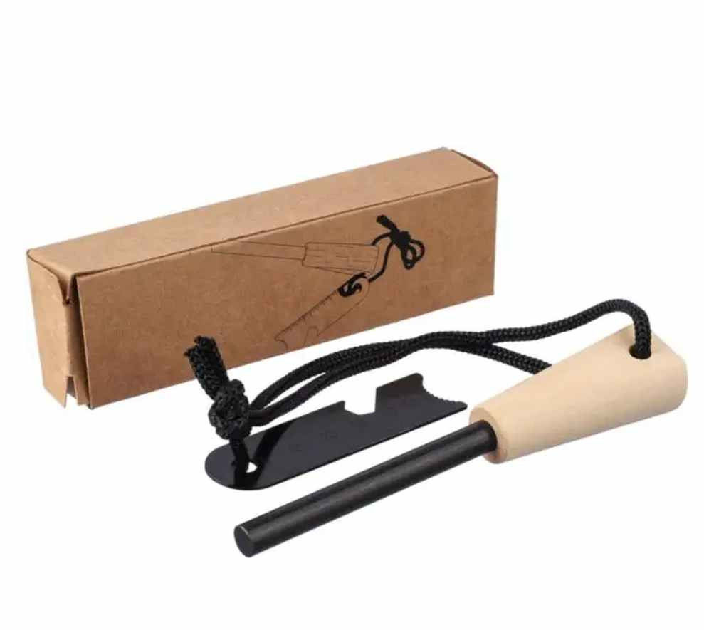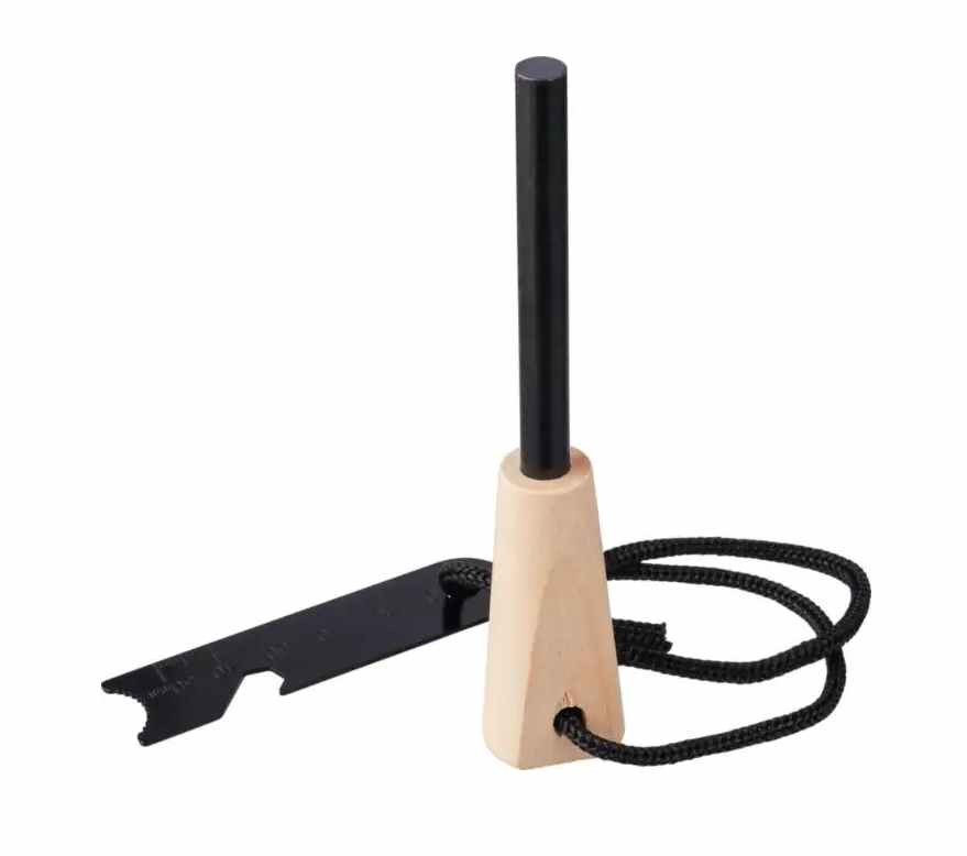 Vuurstarter van Roestvrij Staal. Voel je een echte Robbinson en maak altijd en overal een vuurtje. Het handvat is van grenenhout. De schraper heeft meerdere functie's: Flesopener, meetlat en inbussleutel. Kras op de zwarte coating ven het aansteekstaafje en maak zo de vonken. Dit leuke outdoor presentje is per stuk verpakt in een bruin kartonnen doosje. Uw logo kunnen wij lasergraveren op het hout. U kunt deze vuurstarter ook zonder uw logo bestellen vanaf 25 stuks.