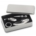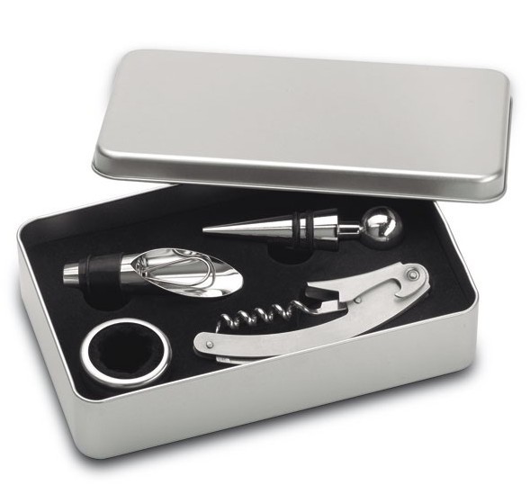 Deze 4-delige wijnset is verpakt in een fraai zilverkleurig blik. De set bestaat uit een flessenopener, lekring, schenktuit en een flessen stop. Uw logo kunnen wij lasergraveren op het deksel. Onderstaande prijs is voor het lasergraveren.