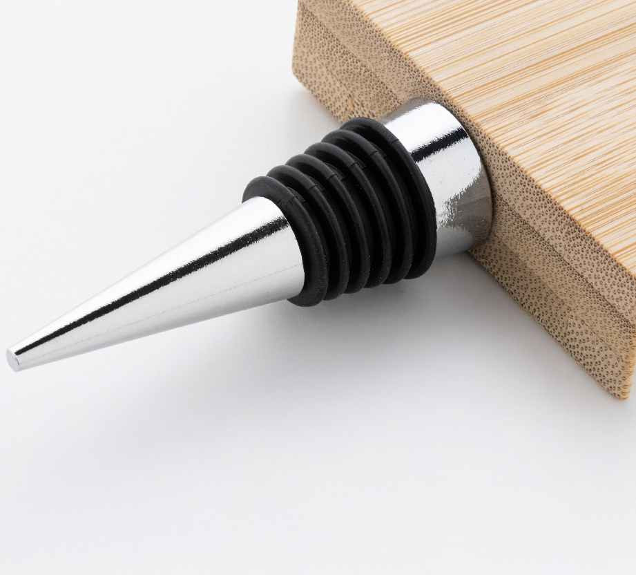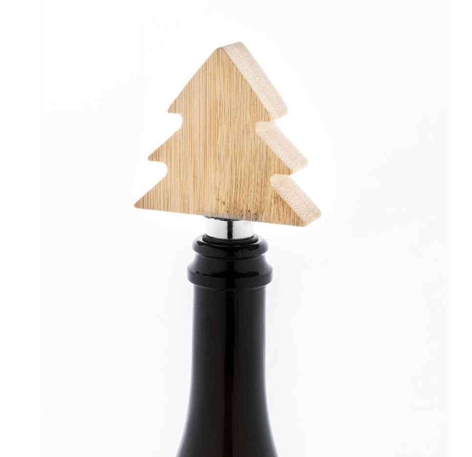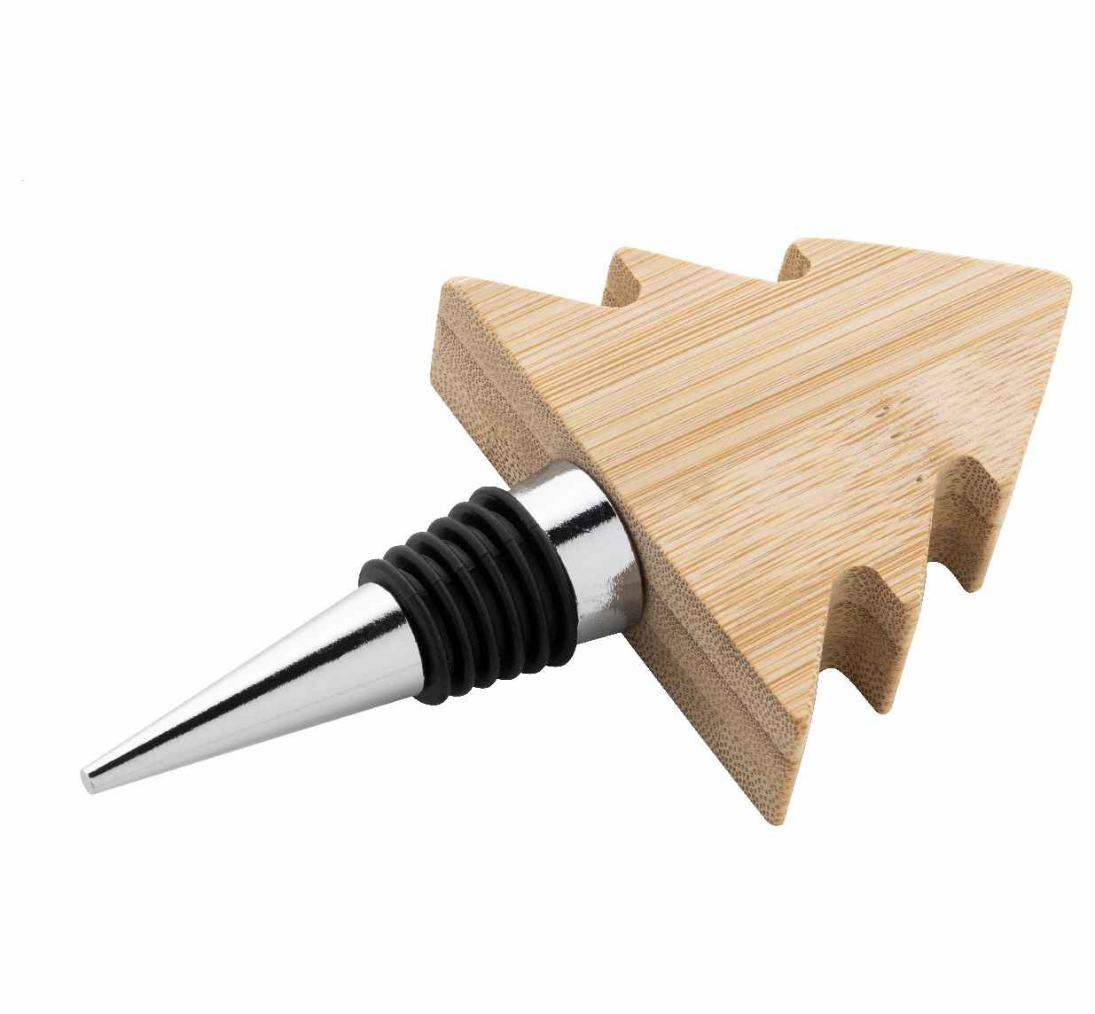 Wijnstopper / Flessenstop van metaal met een houten kerstboomvorm. We kunnen dit leuke kerstgeschenk van uw logo of reclame voorzien door middel van een lasergravure. Uw logo wordt dan met een laserstraal in het hout aangebracht. We kunnen deze wijnstopper ook zonder opdruk aan leveren vanaf 50 stuks.