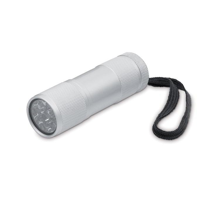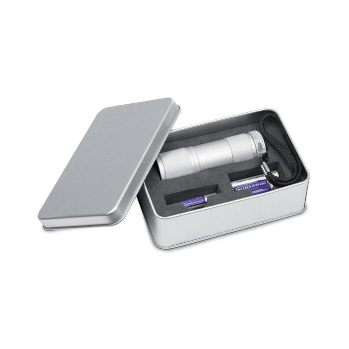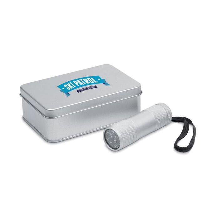 Zaklamp van aluminium. Bevat 9 LED lampjes. Deze zaklamp zit verpakt in een mooi metalen doosje. Wordt geleverd inclusief 3 AAA batterijen. Uw logo kunnen wij drukken op het de zaklamp of op het doosje. We kunnen de artikelen eventueel ook graveren. Indien u wilt dat wij deze graveren dan kunt u het beste contact met ons opnemen.