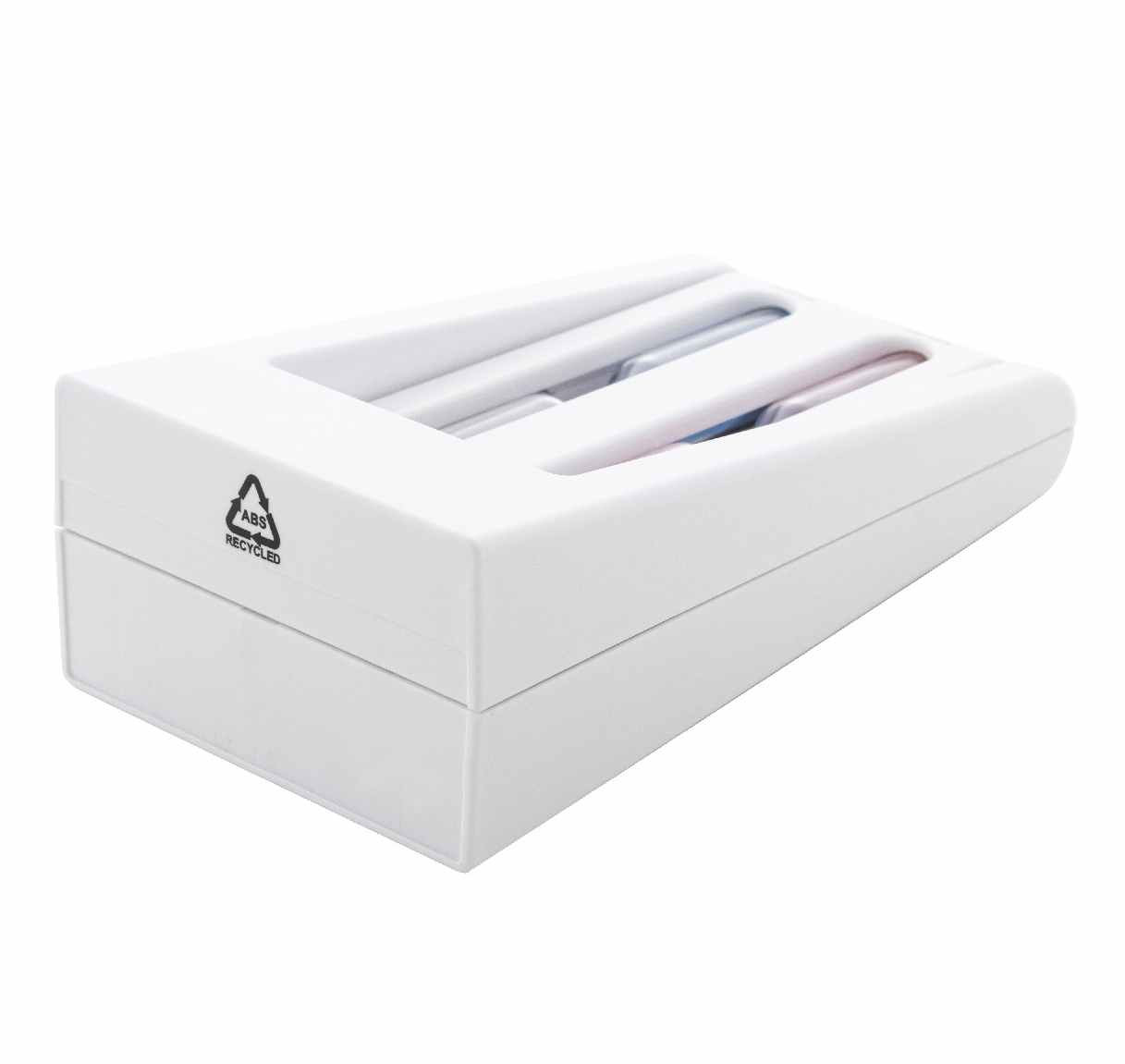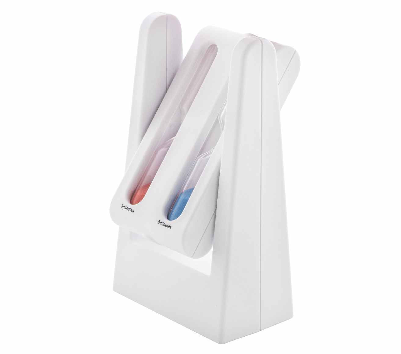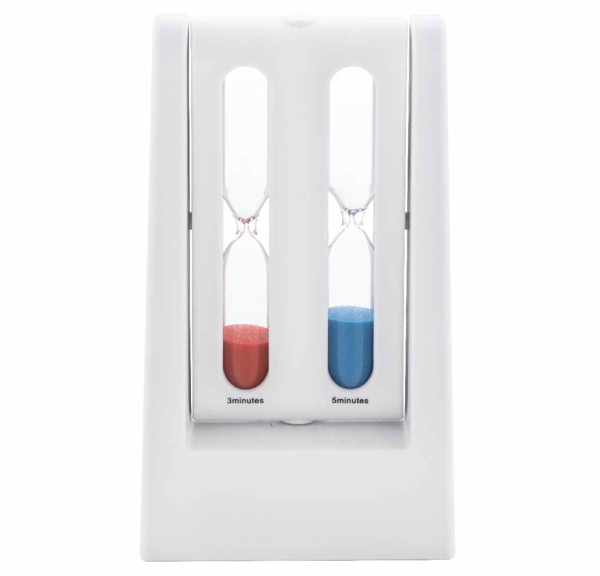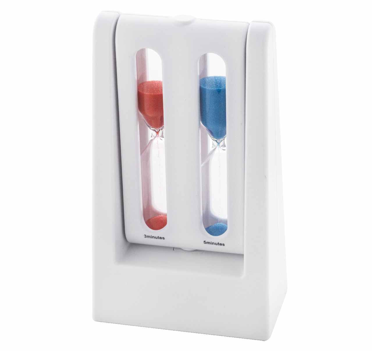 Dubbele Zandloper in een witte kunststof houder. De 2 zandlopers hebben verschillende tijden. 3 minuten en 5 minuten. Uw logo kunnen wij voor u drukken op de standaard. Deze zandlopers kunt u ook zonder uw opdruk bestellen. Dit kand dan al vanaf 25 stuks.
